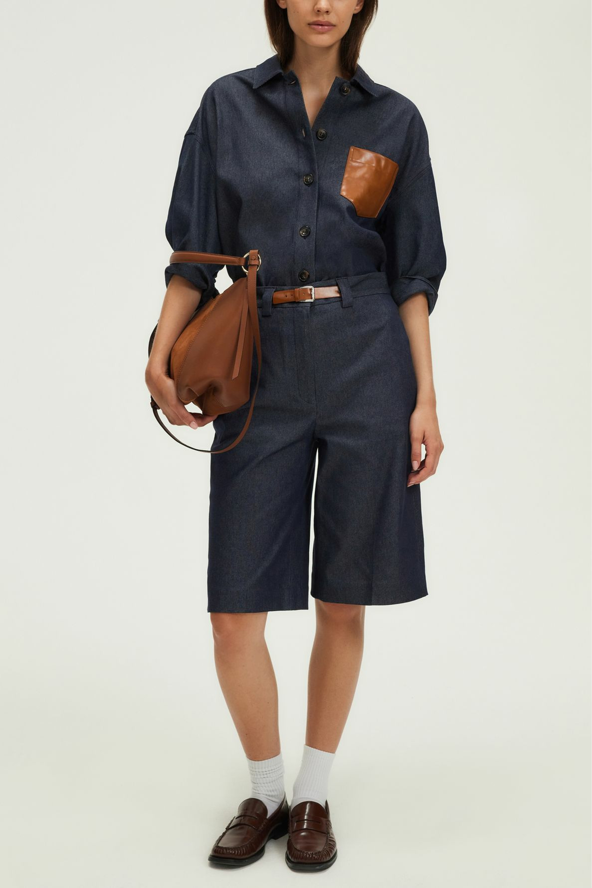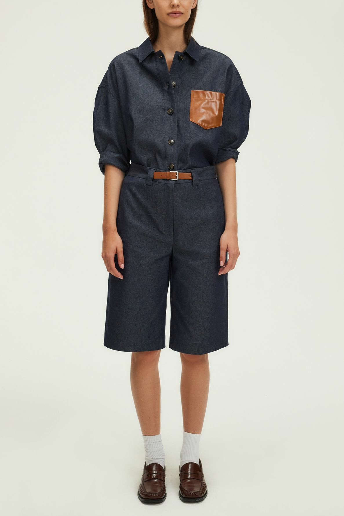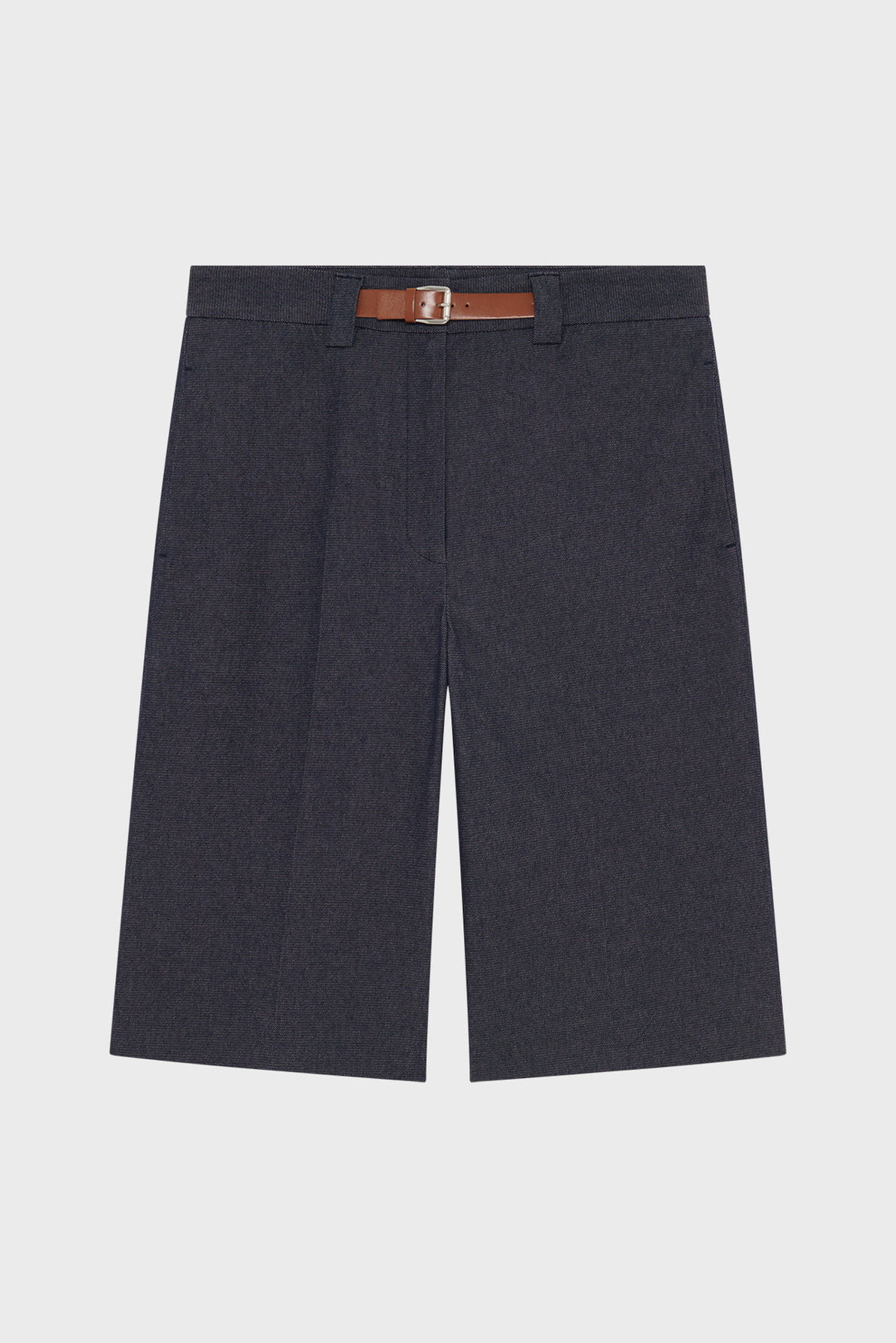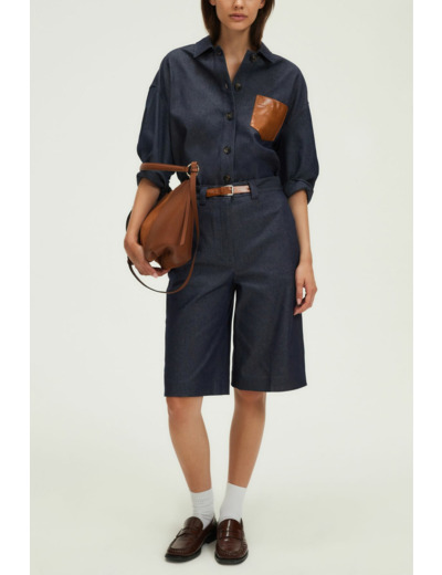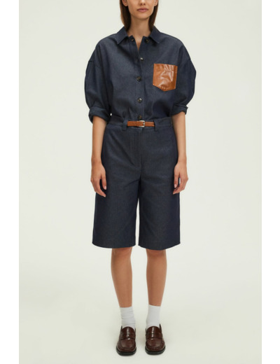 Forme droite, denim brut uni, bermuda long. Fermeture zippée sous patte avec agrafe et bouton cachés. Taille agrémentée d’une ceinture en simili cuir. Matière stretch. Poches italiennes devant, poches plates passepoilées au dos. Pli marqué le long de la jambe.