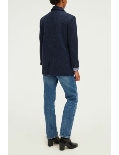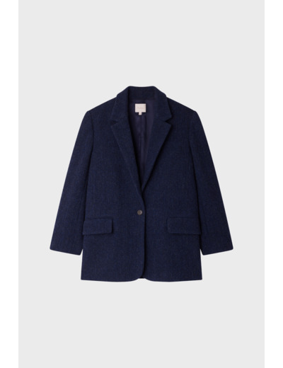 Confectionnée en 100 % laine, cette veste longue jusqu’aux hanches se distingue par son motif chevrons subtil qui apporte du caractère à vos tenues. Le col tailleur et l’emmanchure ajustée renforcent son allure structurée, tandis que les manches longues finies par un bouton rond ajoutent une touche raffinée. Polyvalente, elle s’adapte aussi bien à un look professionnel qu’à une tenue casual chic.