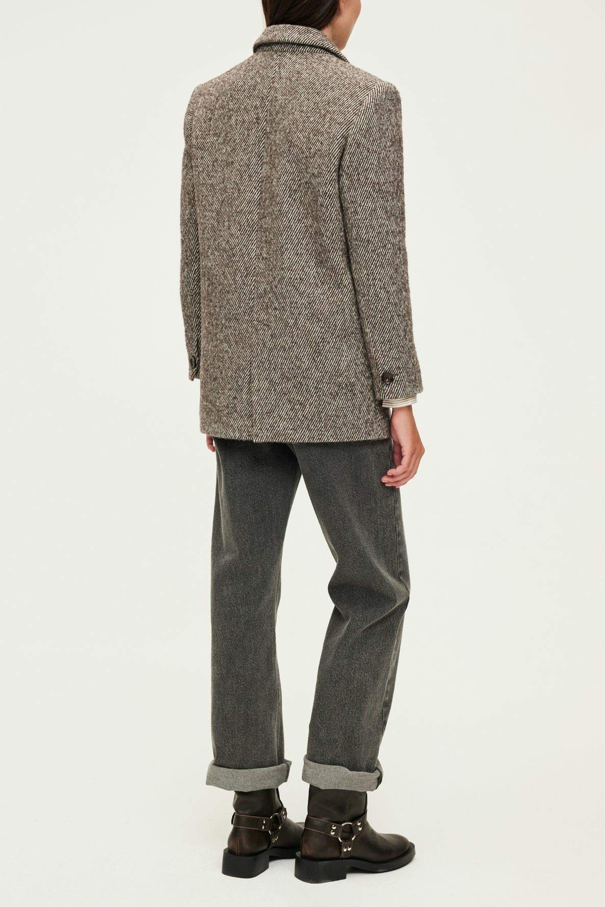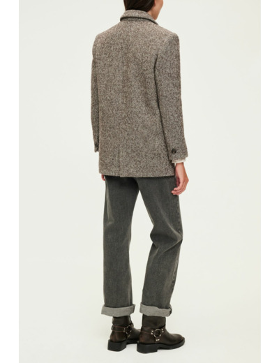Forme droite et large, veste longue jusqu’aux hanches, col et emmanchure tailleur, manches longues avec poignets fermés par un bouton rond, fermeture par un bouton rond unique, fente d’aisance au dos, poches passepoilées à rabat. La mannequin mesure 180 cm et porte une taille 38.