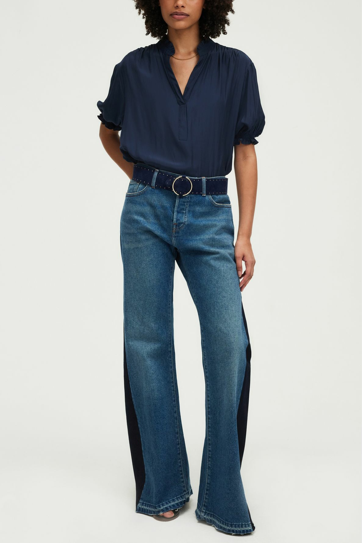 Sublimez votre allure avec cette blouse ample à volants, conçue pour allier élégance et confort. Son bleu marine profond apporte une touche de sophistication intemporelle à votre garde-robe.
