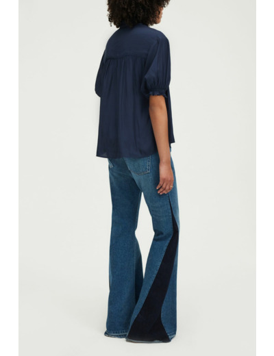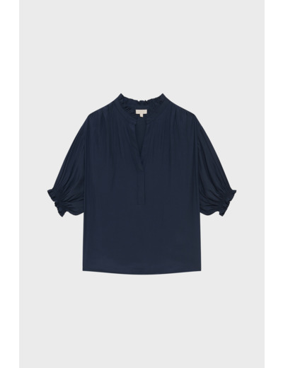 Blouse en satin uni bleu marine profond, coupe droite et ample, emmanchure basse aux épaules, col montant à volants, manches courtes avec bas élastiqué à volants, empiècement plissé dans le dos.