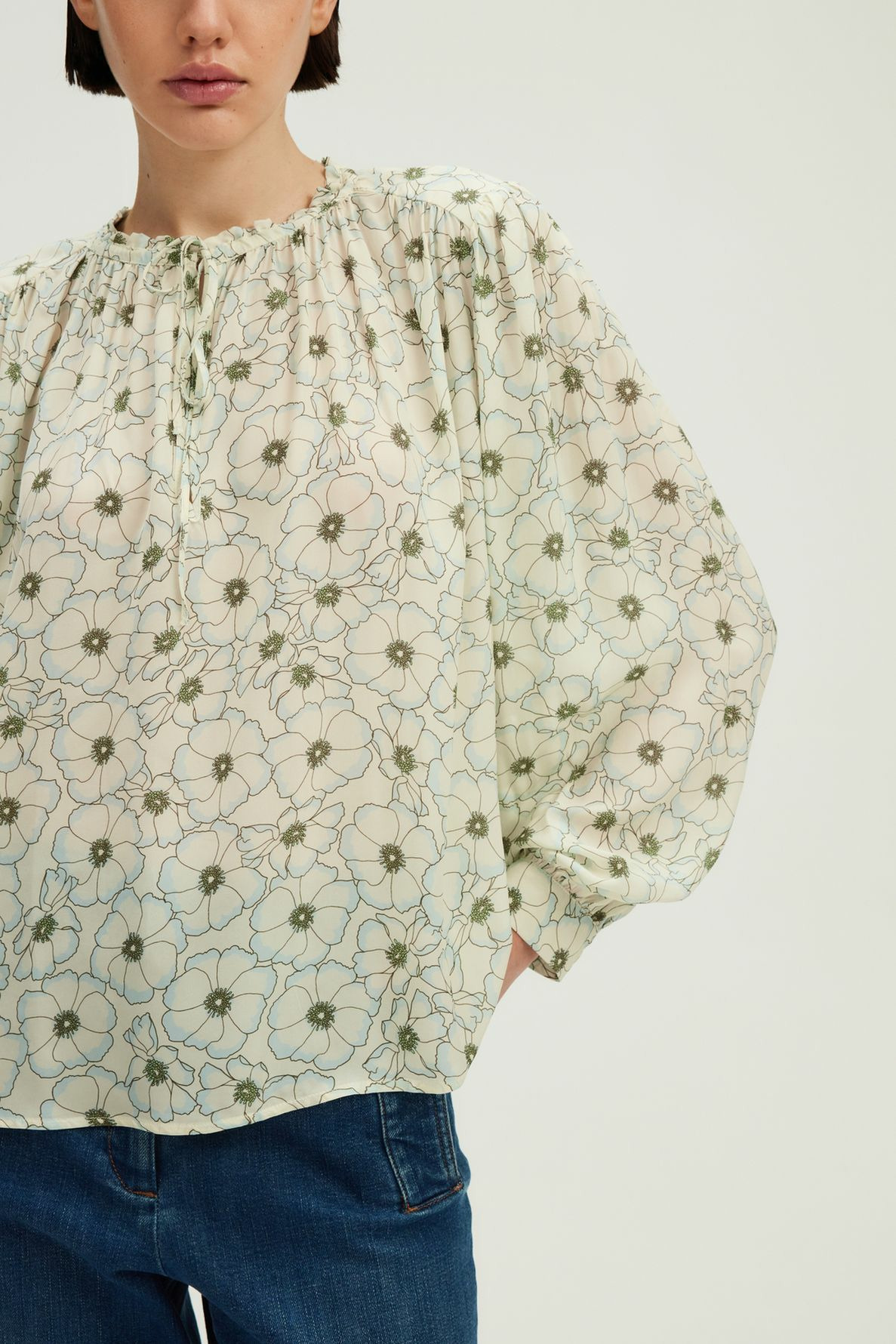 Matière au toucher soyeux, coupe droite, motif floral imprimé de pivoines, col rond avec décolleté et lien de serrage, manches longues avec poignets boutonnés, plis décoratifs aux épaules et en haut du dos, bas arrondi.