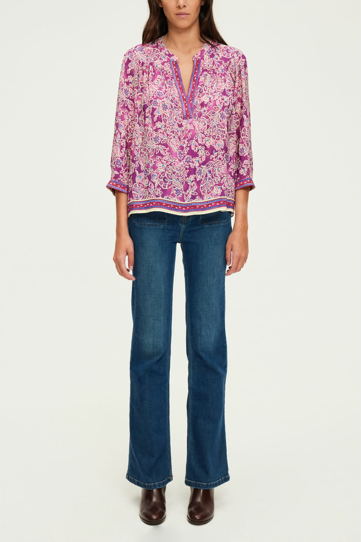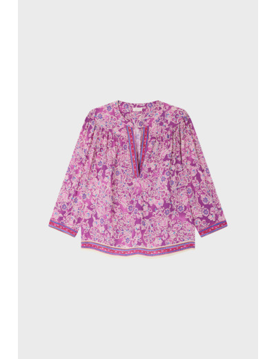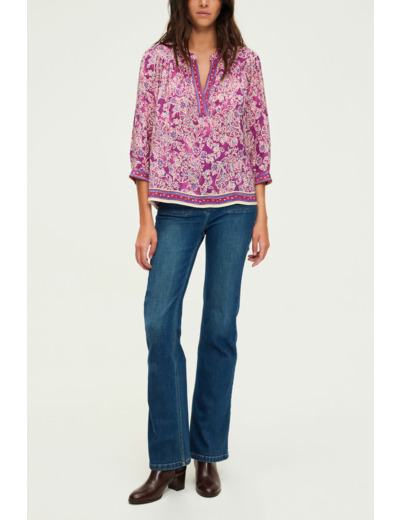 Blouse fluide colorée avec imprimé bouquets. Matière douce au toucher soyeux. Forme ample. Manches 7/8 avec poignets fermés par un bouton rond. Empiècement avec plis à la carrure. Plis en haut du dos. Finitions avec une frise de motifs. La mannequin mesure 180 cm et porte une taille 2.