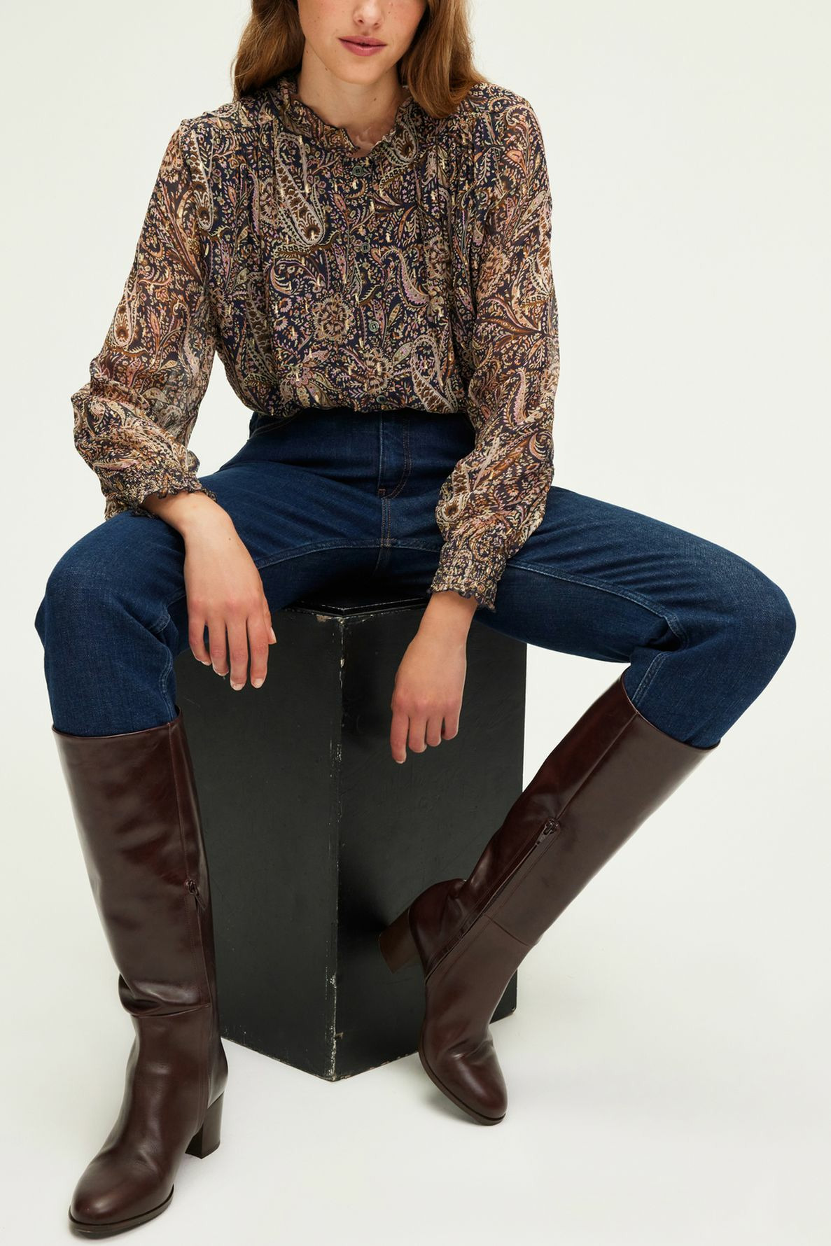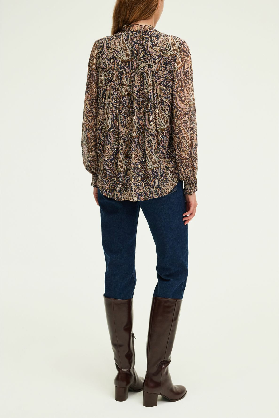 Forme droite, motif cachemire avec lurex, longueur standard, col montant à volants, manches longues, poignets élastiqués smockés, fermeture par petits boutons, plis dans le dos. La mannequin mesure 174 cm et porte une taille 2.
