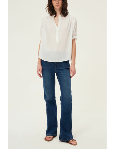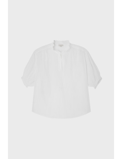 Blouse unie en tissu légèrement satinée et plissé, coupe droite et ample, longueur standard. Col montant avec petits volants, manches courtes élastiquées avec volants. Empiècement plissé au dos. La mannequin mesure 175 cm et porte une taille 38.