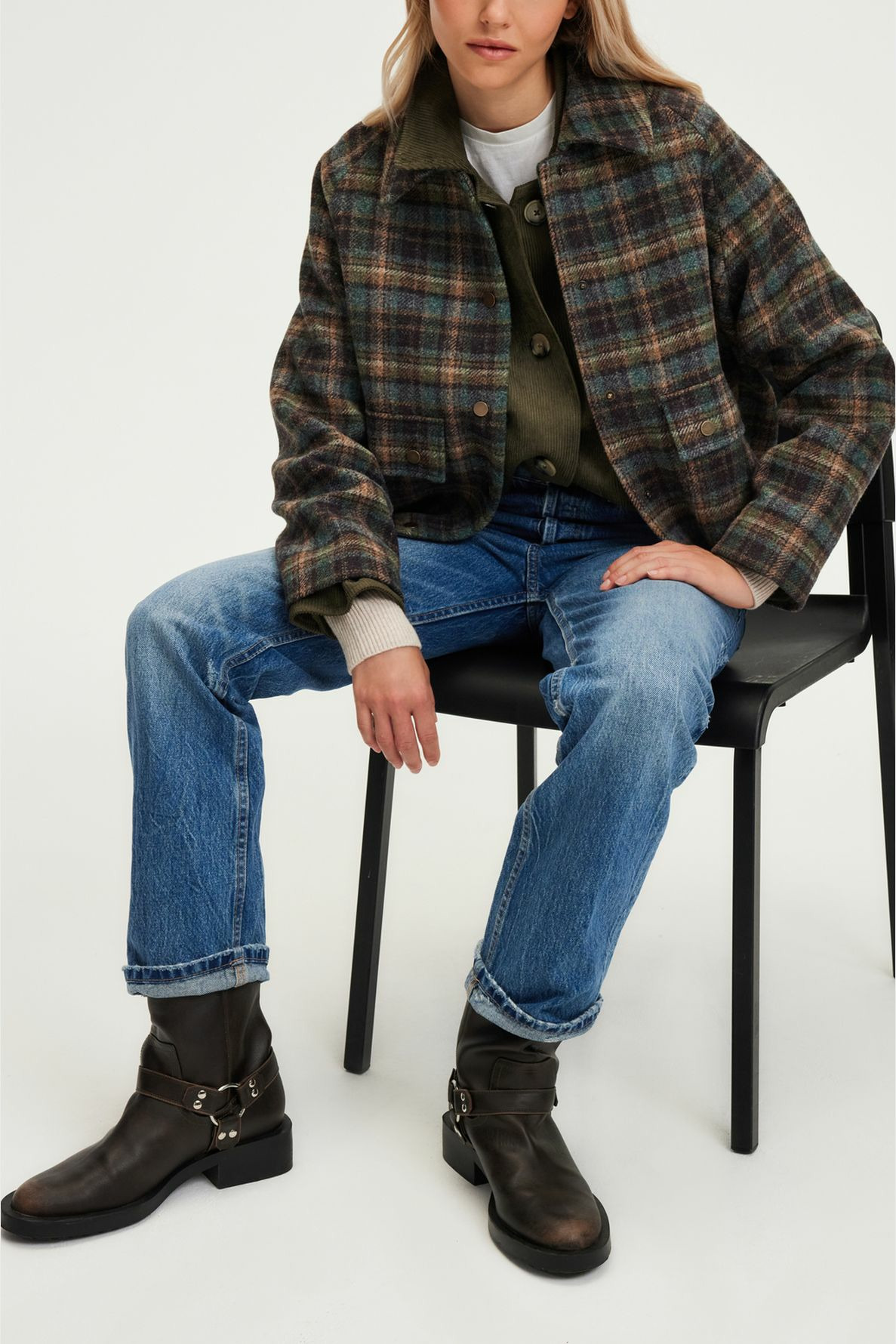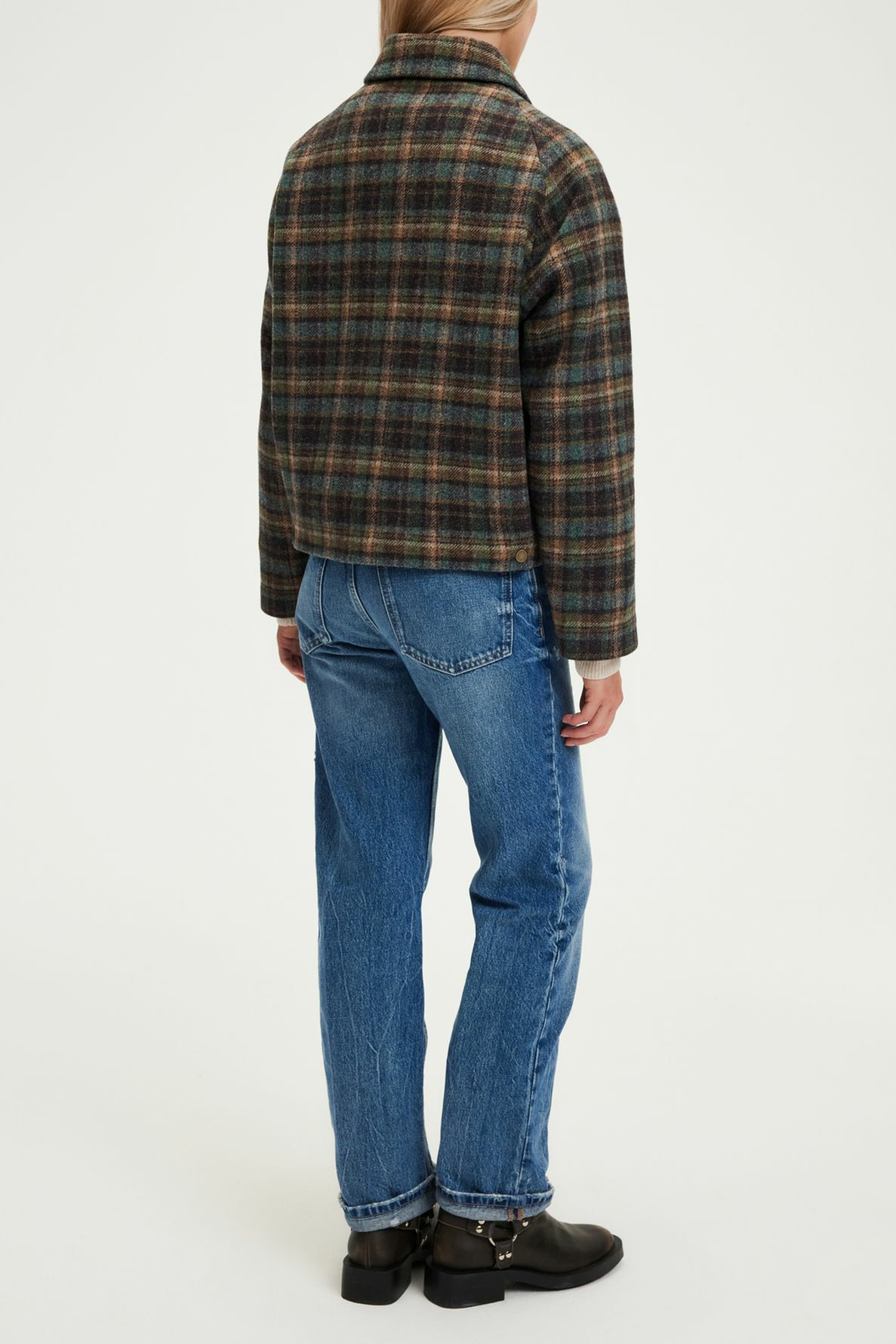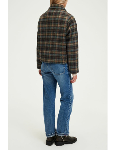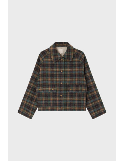 Forme droite, motif à carreaux, emmanchure raglan, col chemise, manches longues. Fermeture par boutons pression. Poches à rabat avec boutons. La mannequin mesure 174 cm et porte une taille 2.