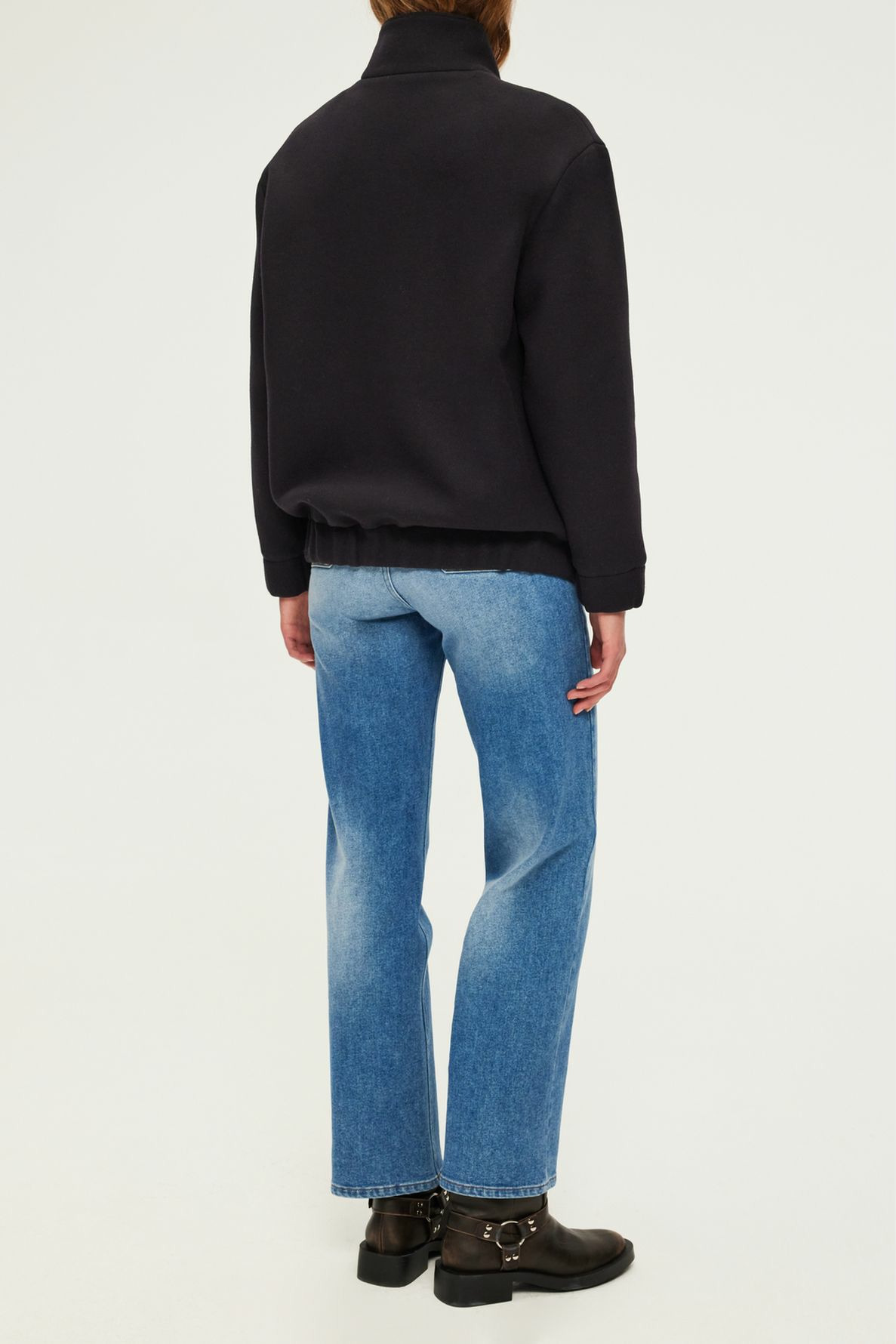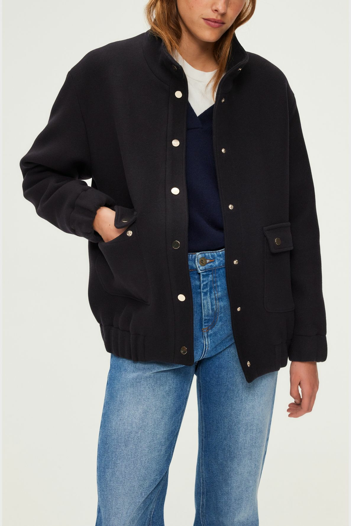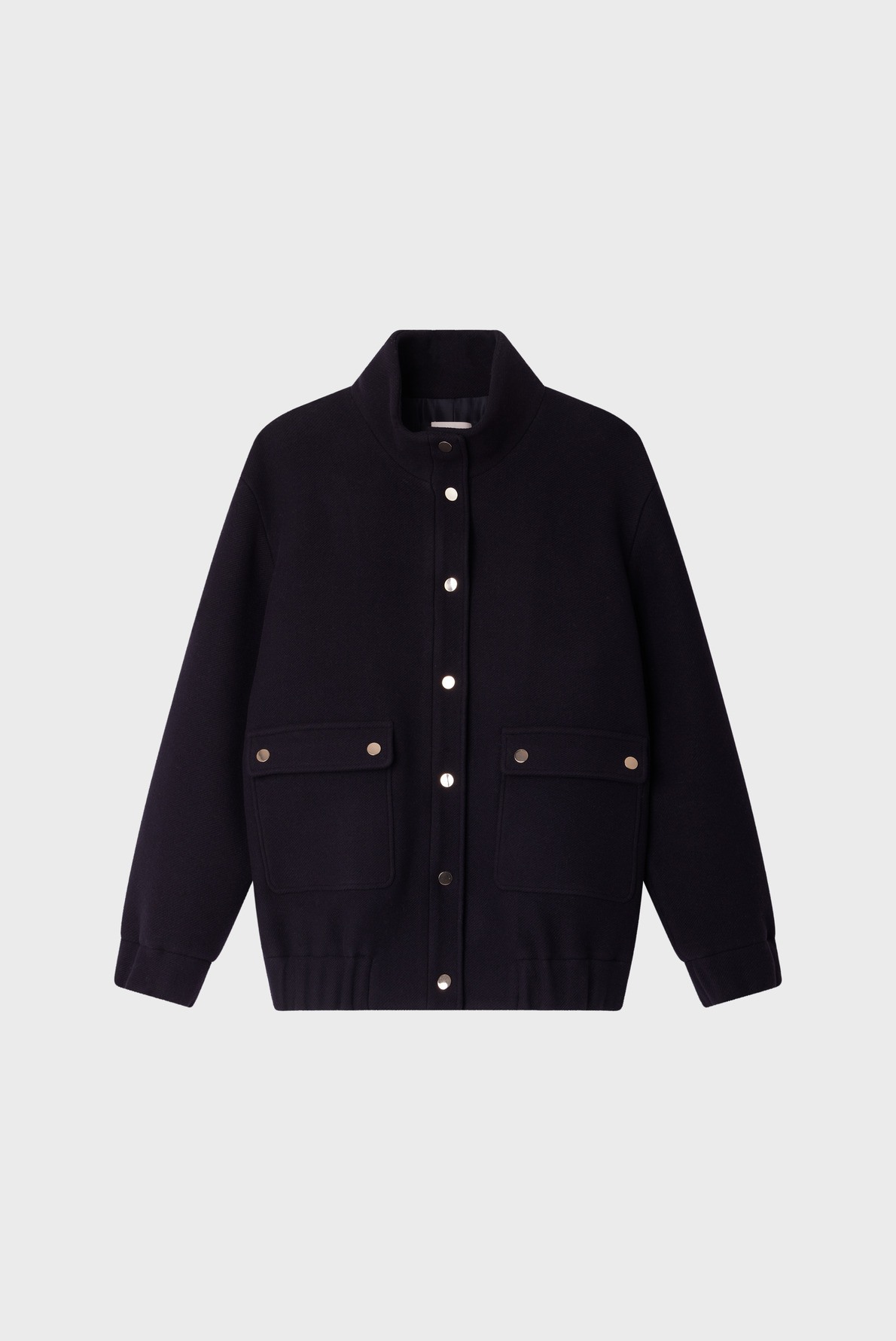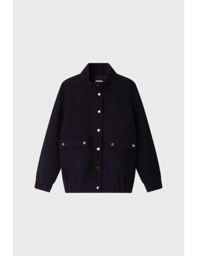 Blouson à col montant en drap de laine uni, forme droite, manches longues avec poignets élastiqués. Fermeture par boutons ronds dorés, poches à rabat assorties. Bas resserré par bord élastique. Laine vierge de première tonte, la plus fine et douce. Emmanchure basse pour plus de confort. La mannequin mesure 174 cm et porte une taille 2.
