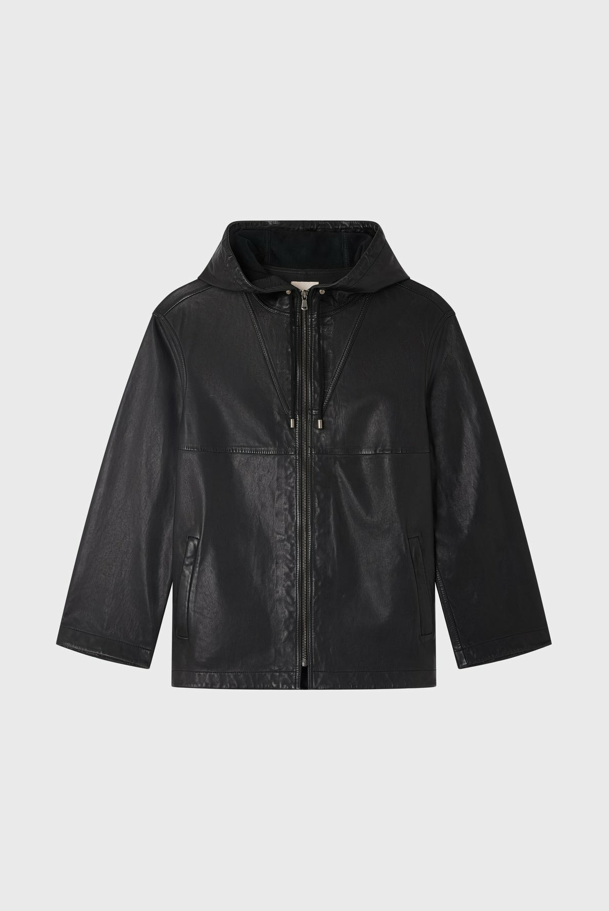 Forme droite, blouson court, cuir uni d’agneau, col à capuche avec lien de serrage, manches longues, fermeture zippée, poches verticales zippées, découpes esprit biker. La mannequin mesure 180 cm et porte une taille 2.