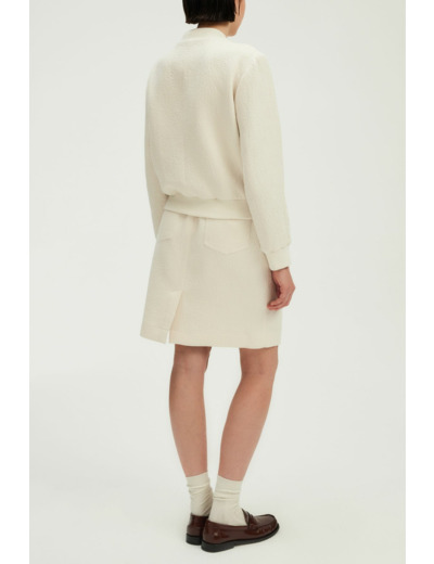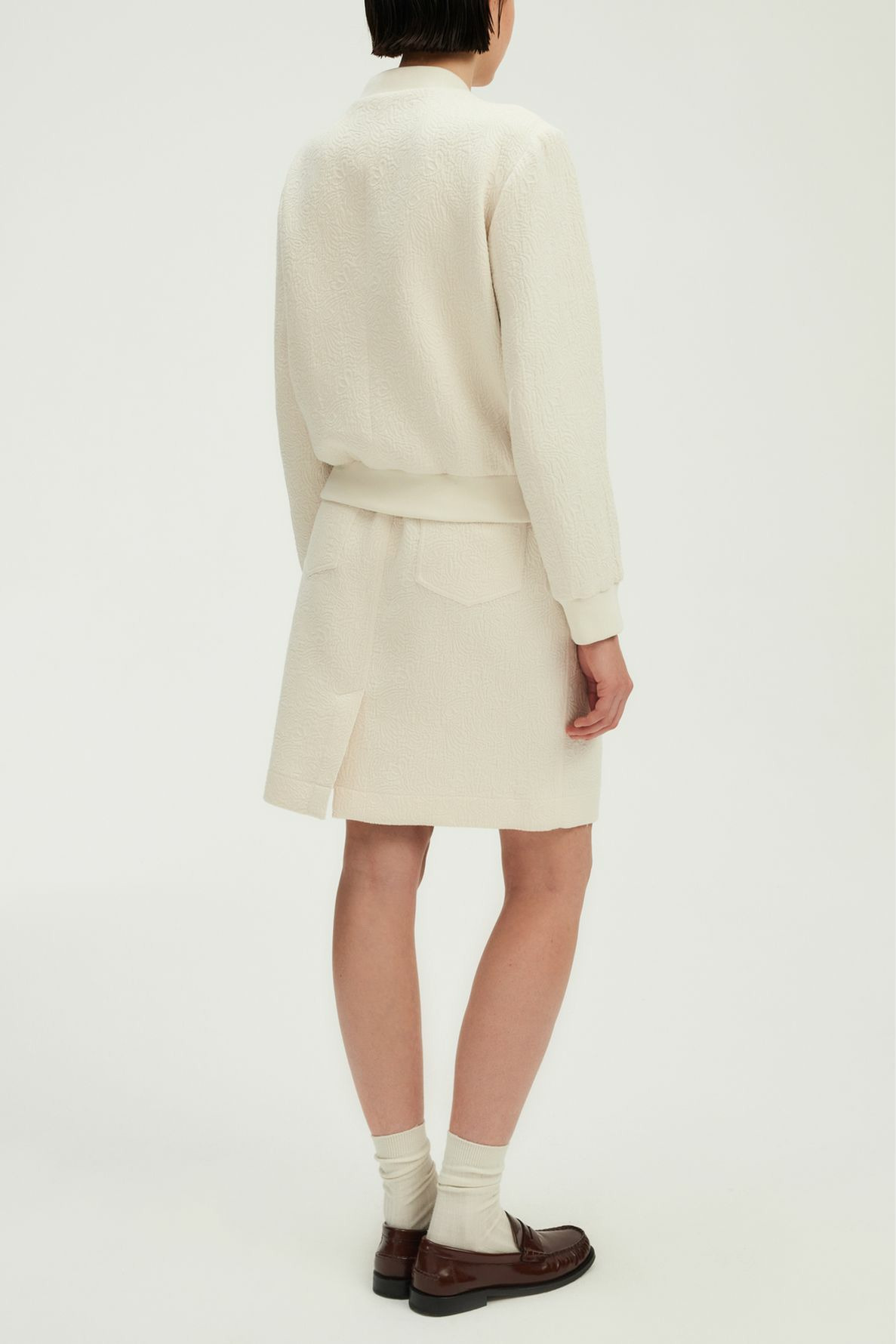 Conçu pour sublimer vos tenues, ce bomber se distingue par son motif floral en relief qui apporte une texture unique et un jeu de lumière subtil. À porter avec la jupe assortie pour un total look harmonieux ou avec un jean pour une allure décontractée-chic. Le col rond montant et l’emmanchure basse offrent un confort optimal tout en soulignant la ligne des épaules.