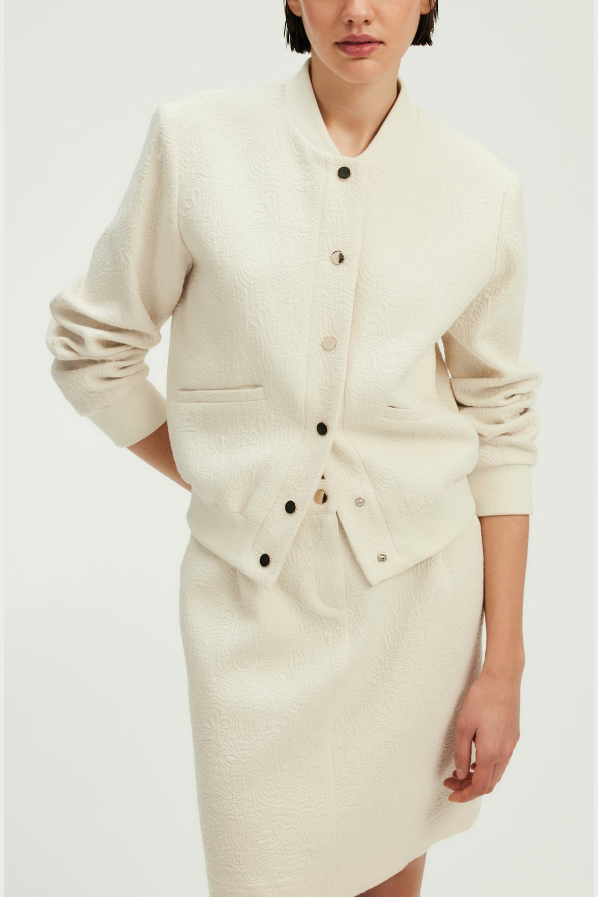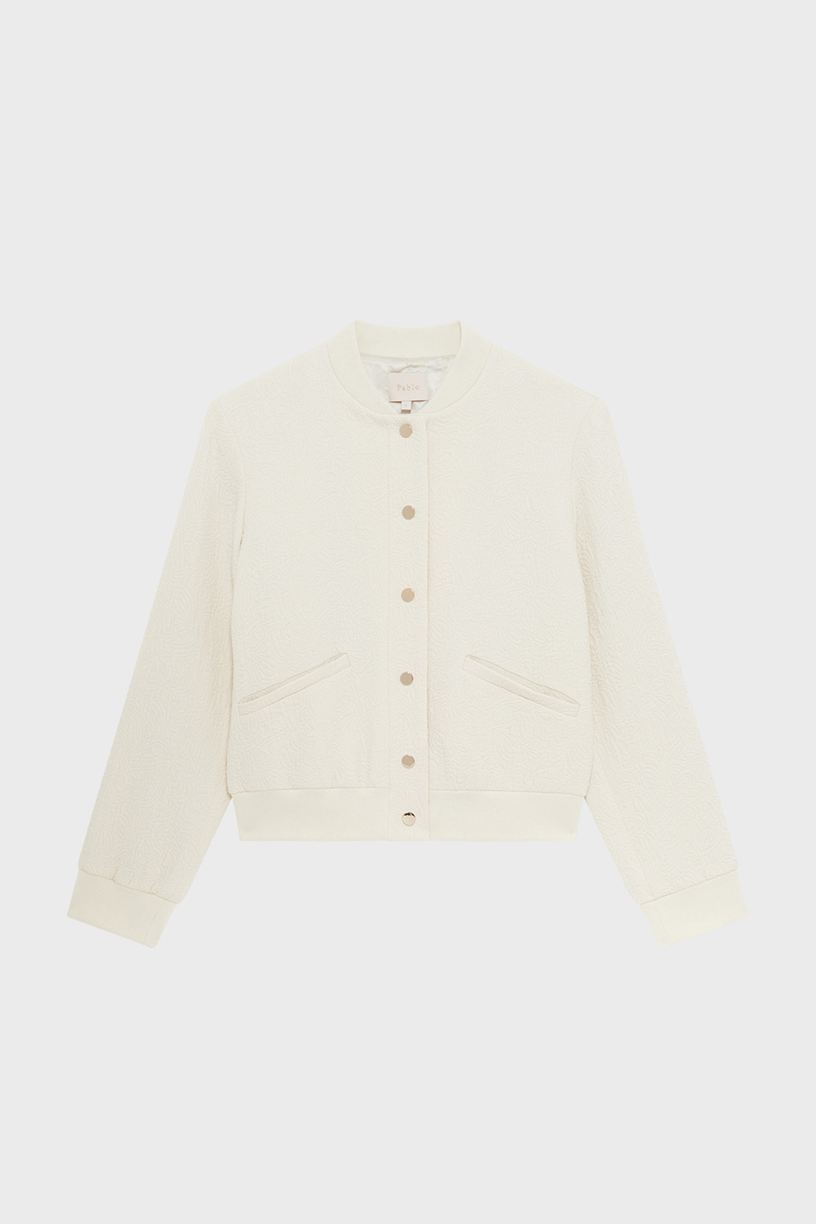Forme droite resserrée, motif floral ton sur ton en relief, veste courte, emmanchure basse, col rond montant, manches longues, fermeture par boutons dorés pression, poches passepoilées en biais, bas de manches et bas du bomber élastiqués.