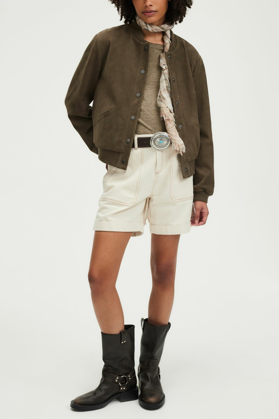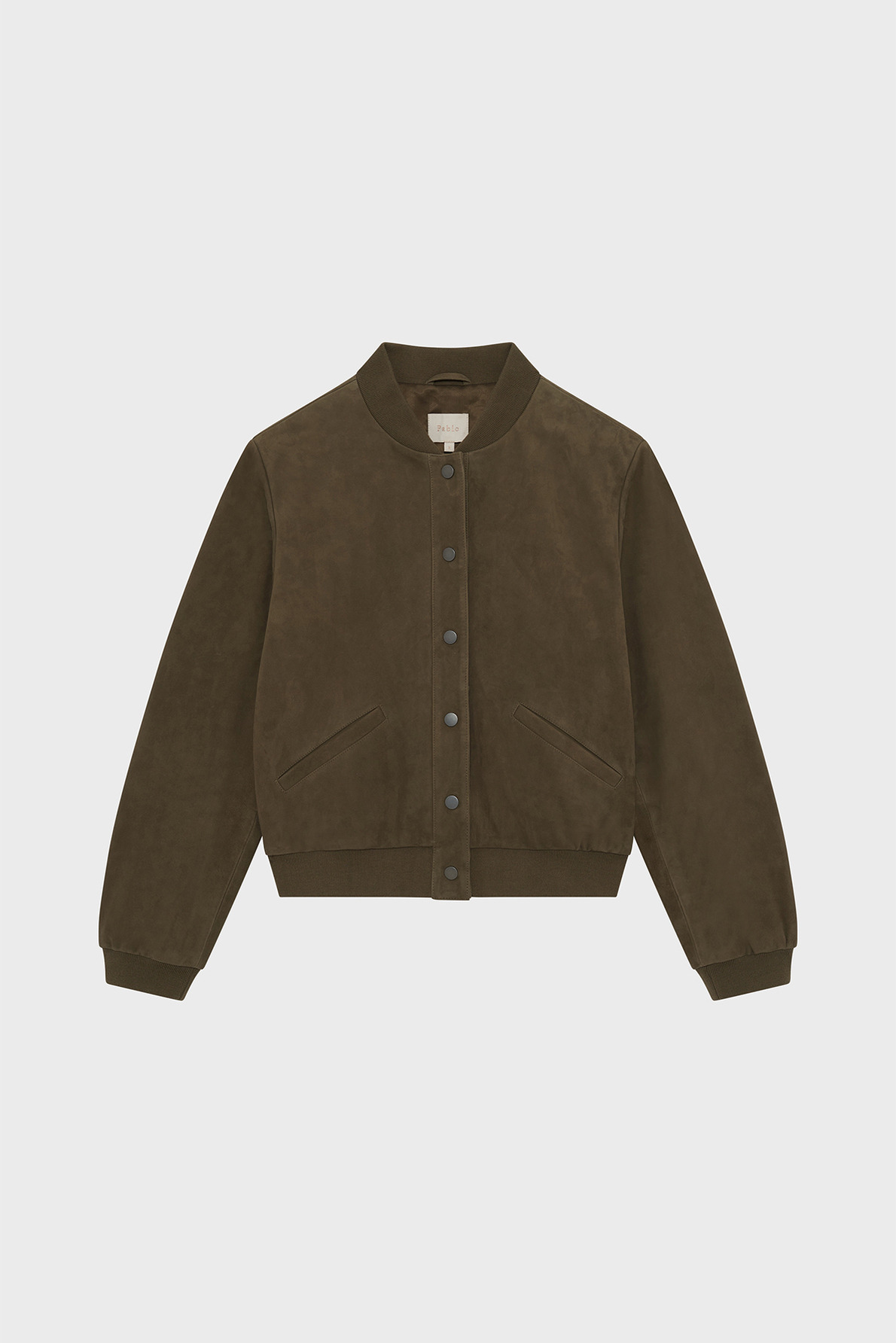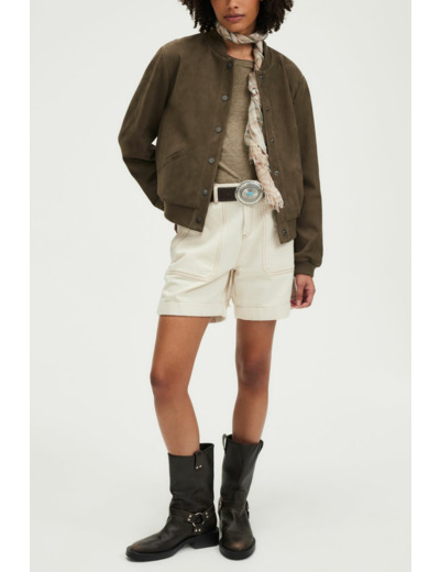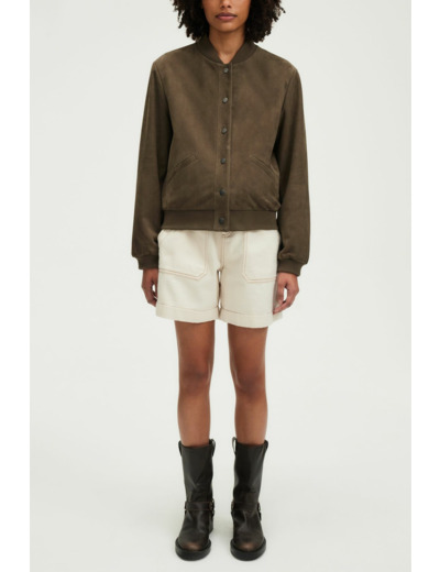 Blouson court en chèvre velours uni, coupe boyfriend droite. Col montant, manches longues avec poignets resserrés par bord-côtes élastique. Fermeture par boutons pression. Poches en biais. Bord-côtes élastiqué au col, aux manches et au bas du blouson.