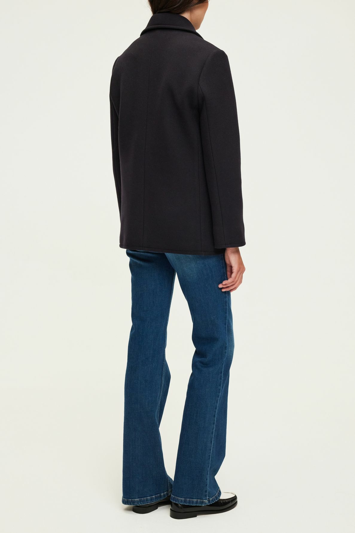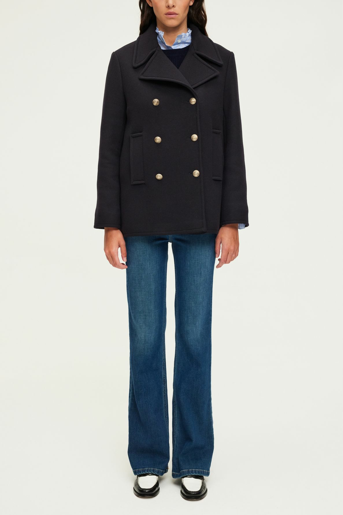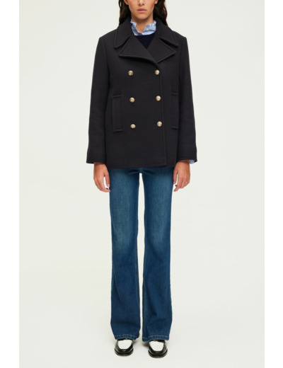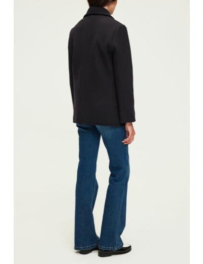 Forme droite, manteau court, col et emmanchure tailleur, manches longues. Boutonnage croisé fermé par six boutons gravés. Drap de laine vierge mélangée uni. Poches verticales passepoilées. La mannequin mesure 180 cm et porte une taille 38.