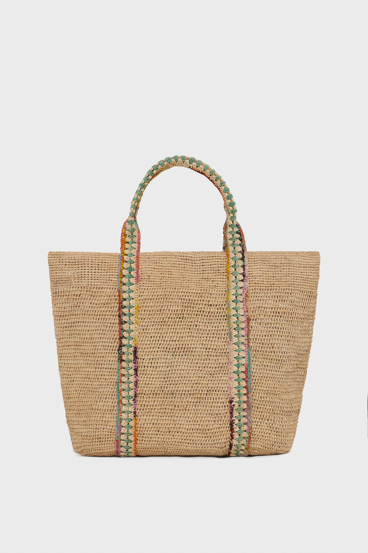 Cabas en raphia crocheté main avec bandes multicolores. Porté main ou épaule grâce à une flèche de poignée de 17 cm. Poche intérieure plaquée. Dimensions : longueur 43 cm, hauteur 30 cm, profondeur 16 cm.