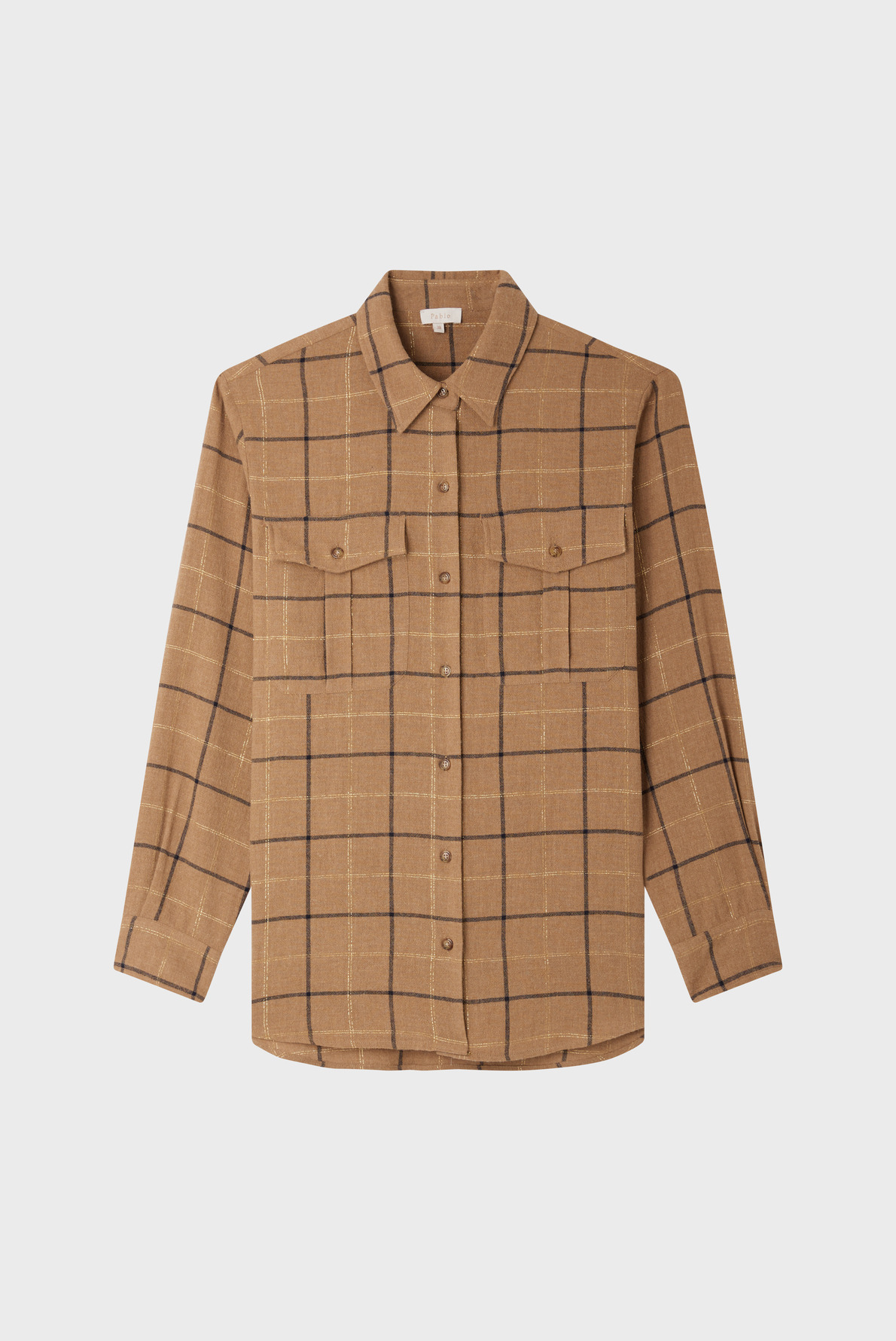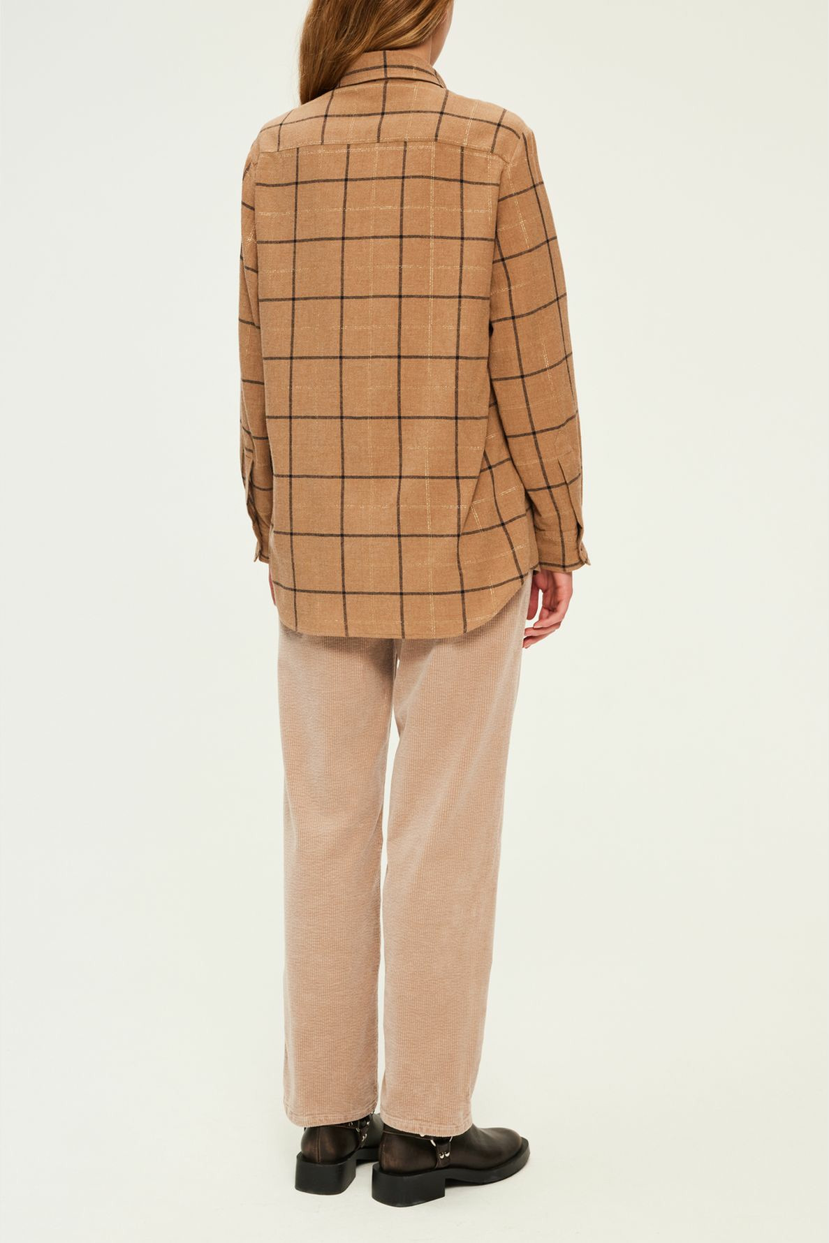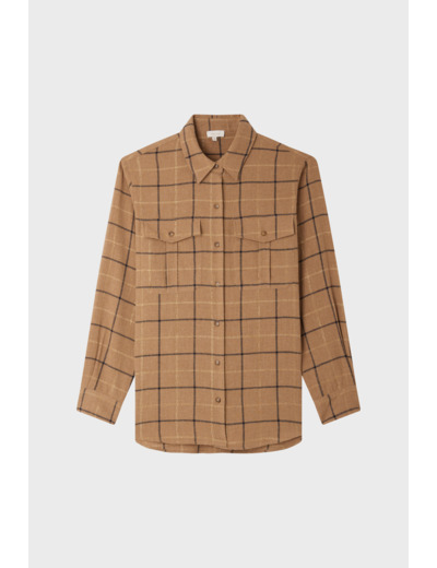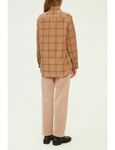 Chemise longue sous les hanches, forme ample, motif à carreaux, col chemise fermé par un bouton, manches longues avec poignets boutonnés, fermeture par boutons ronds, poches poitrine à rabat et bouton. La mannequin mesure 174 cm et porte une taille 38.