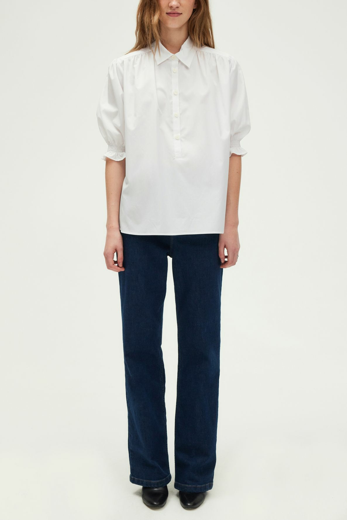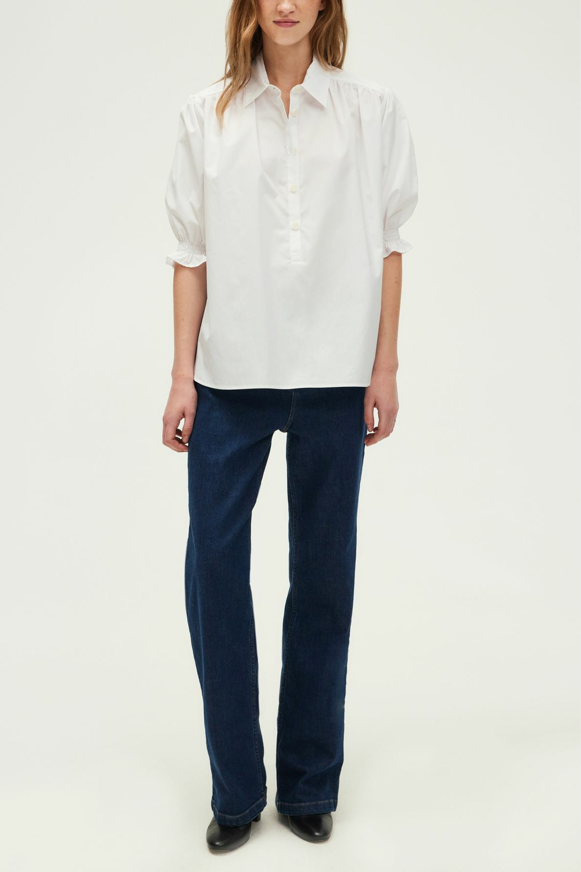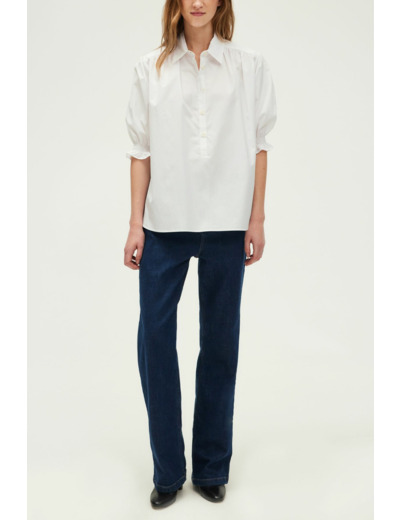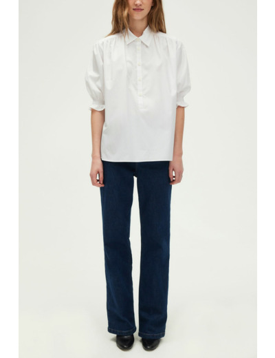 100% coton, forme droite ample, col chemise, manches courtes avec smocks élastiqués, petits plis aux épaules, empiècement plissé dans le dos, encolure fermée par petits boutons, bas arrondi avec fentes sur les côtés.