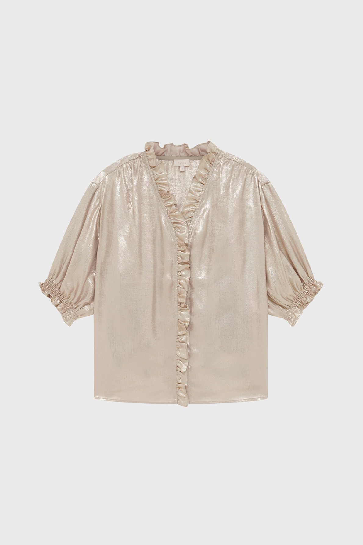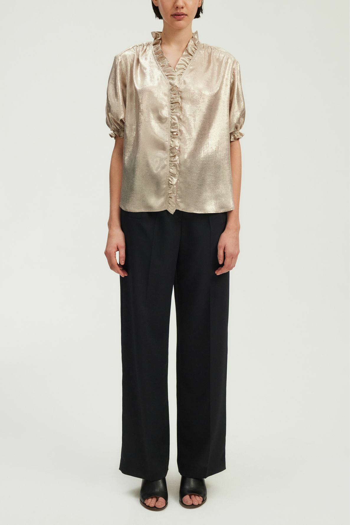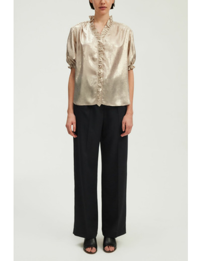Tissu doré uni, col V avec volants, patte de boutonnage ornée de volants, manches courtes avec bas élastiqués à volants, forme droite ample, empiècement plissé dans le dos, bas arrondi.