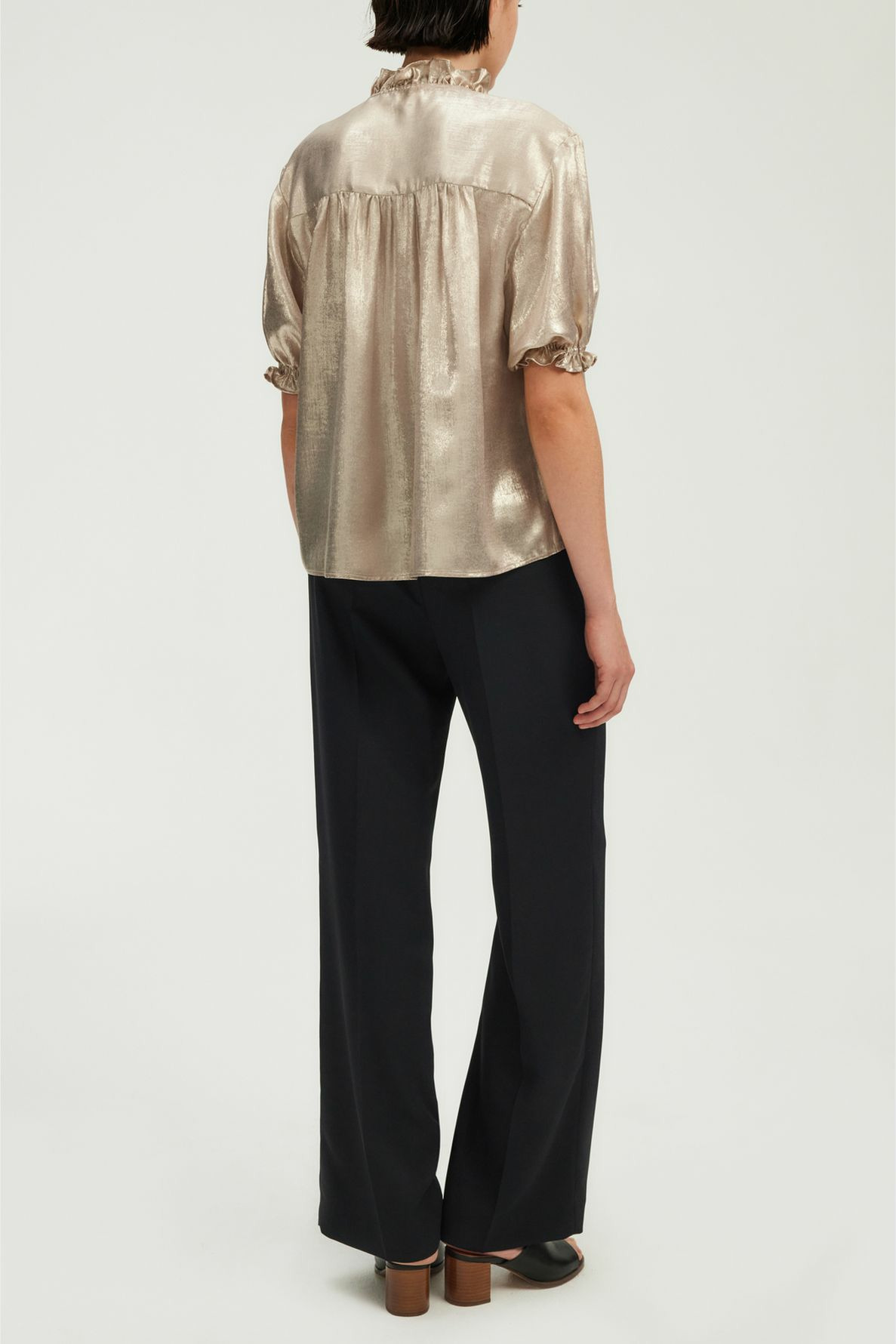 Tissu doré uni, col V avec volants, patte de boutonnage ornée de volants, manches courtes avec bas élastiqués à volants, forme droite ample, empiècement plissé dans le dos, bas arrondi.
