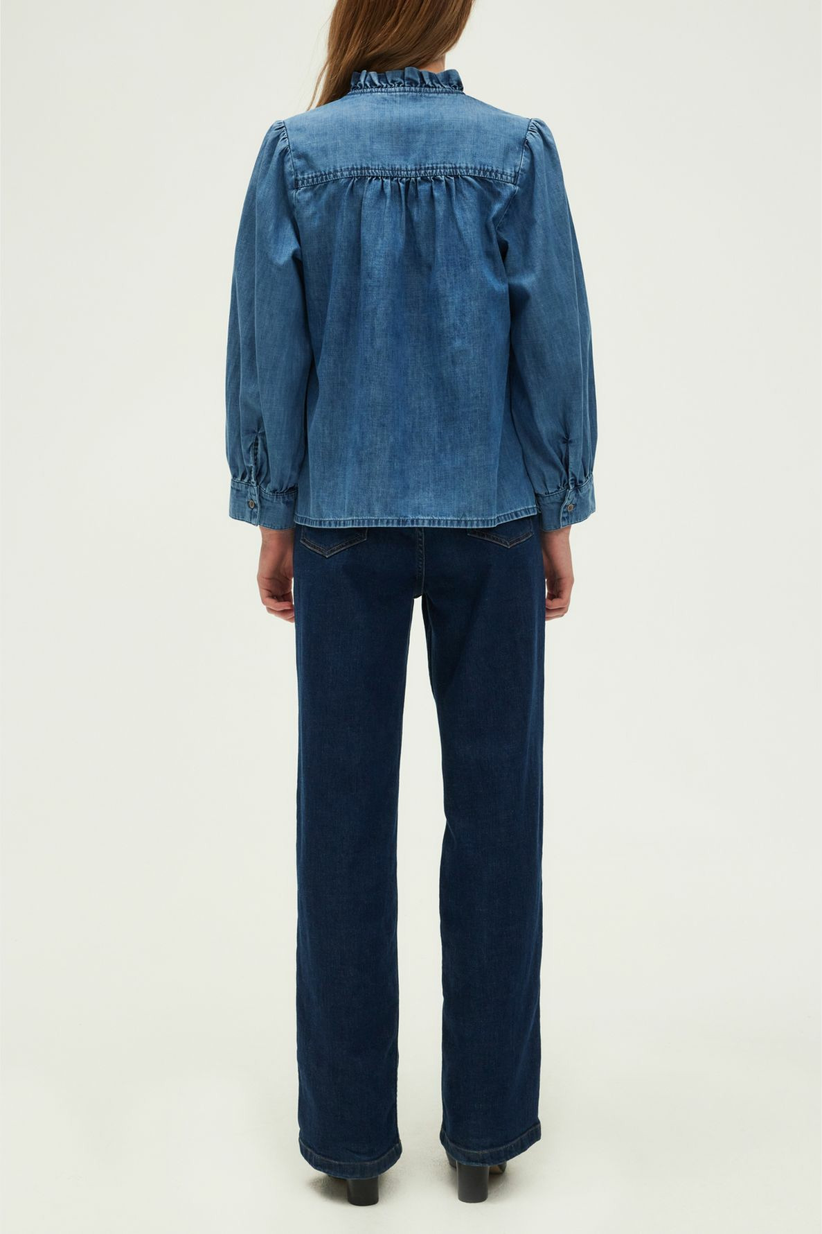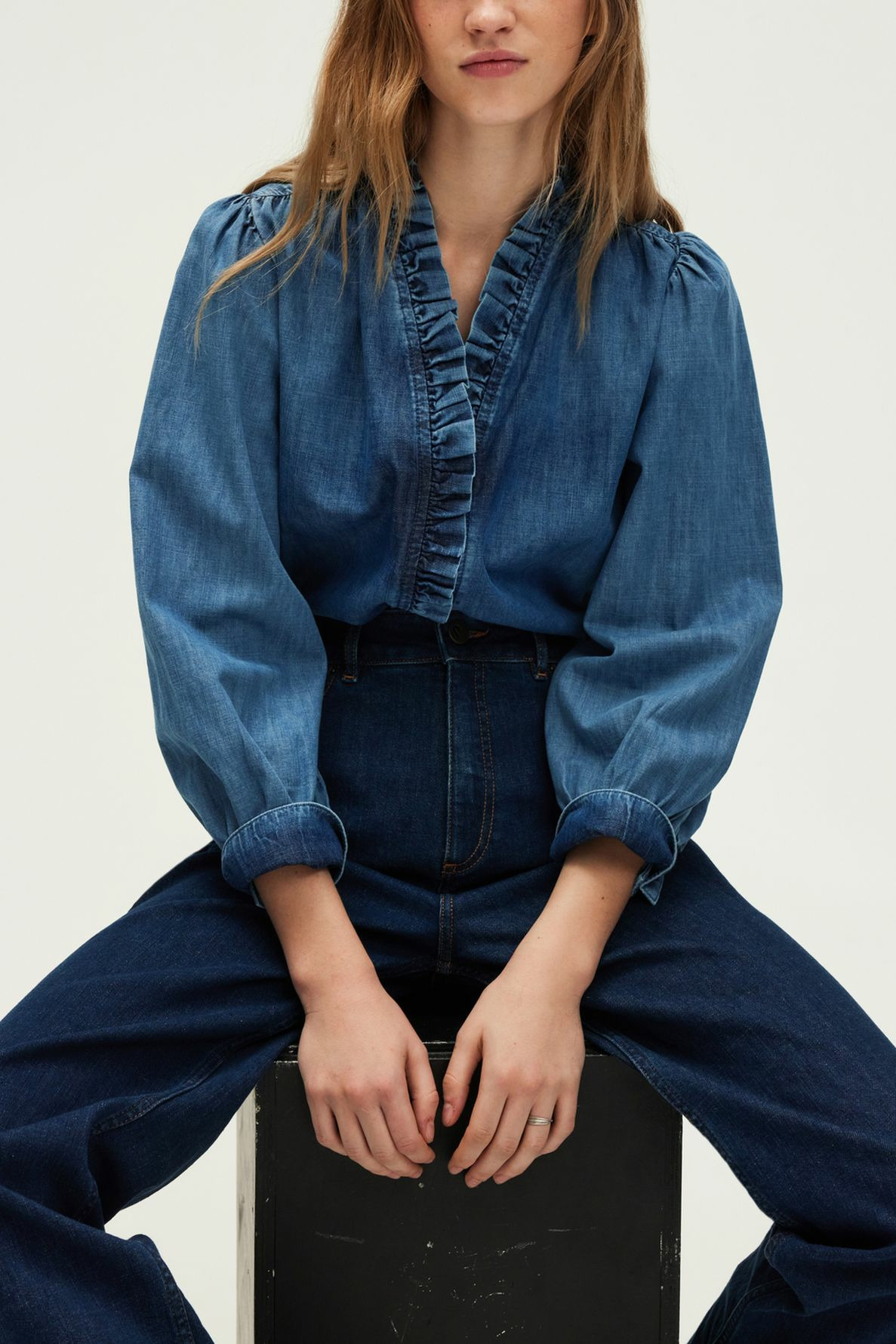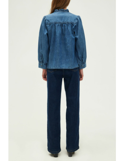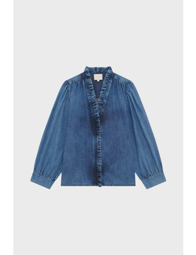 Denim uni, col V à volants, manches longues avec poignets boutonnés, fermeture par boutons sous patte volantée, empiècement avec plis dans le dos, fronces aux épaules, coupe droite évasée, petites fentes latérales.