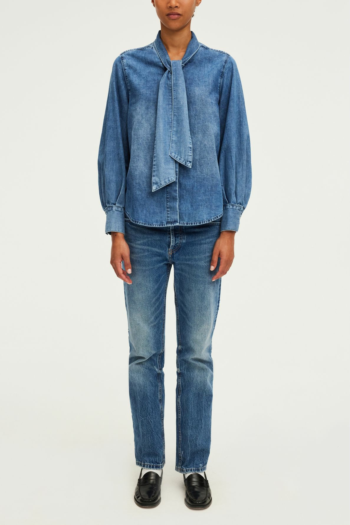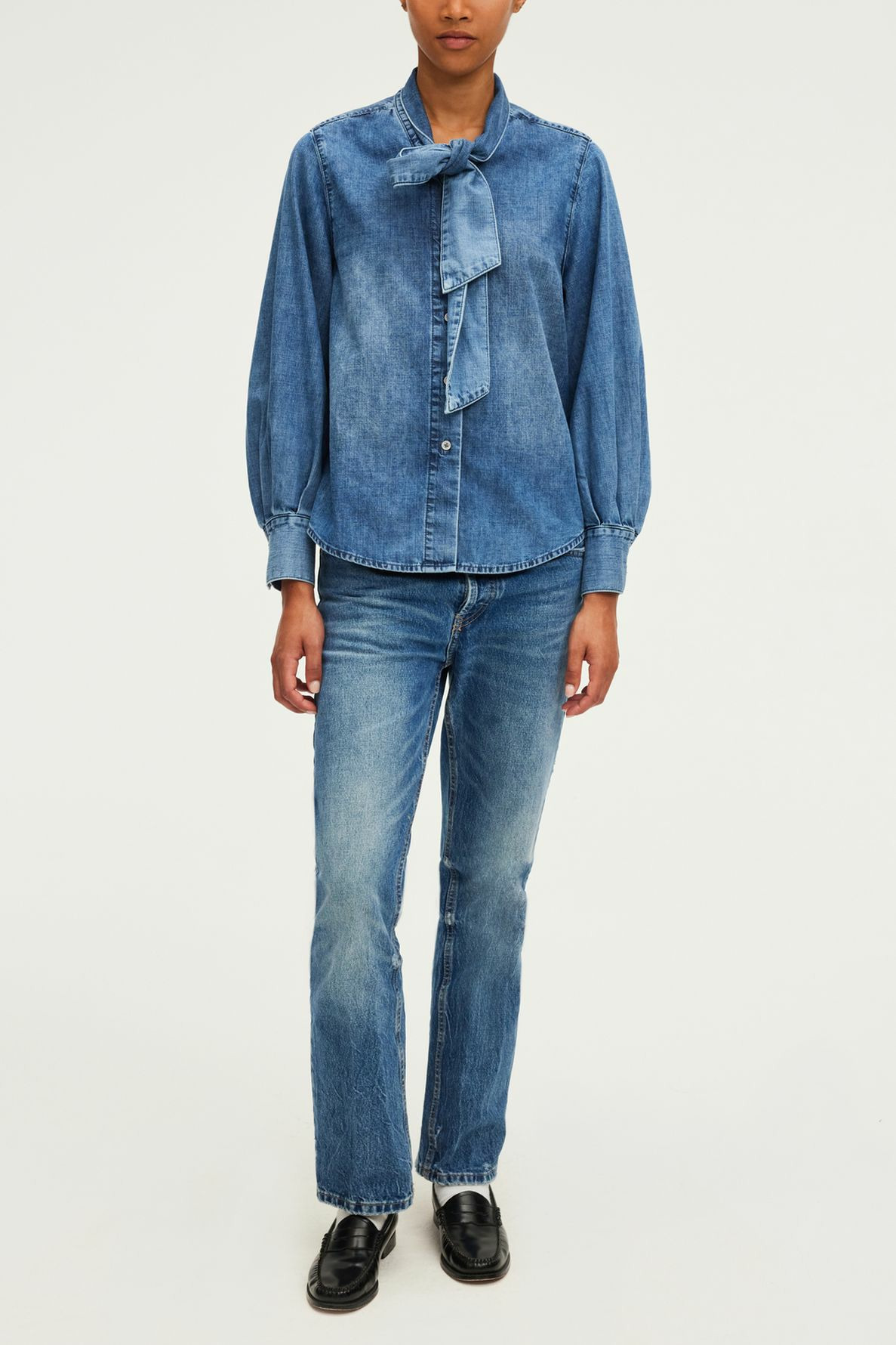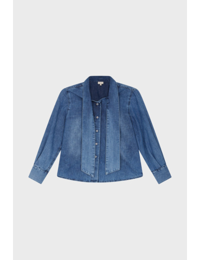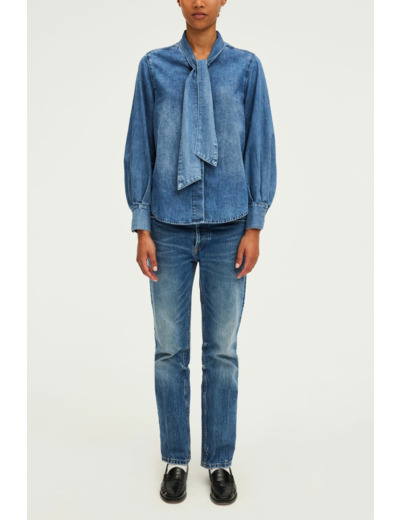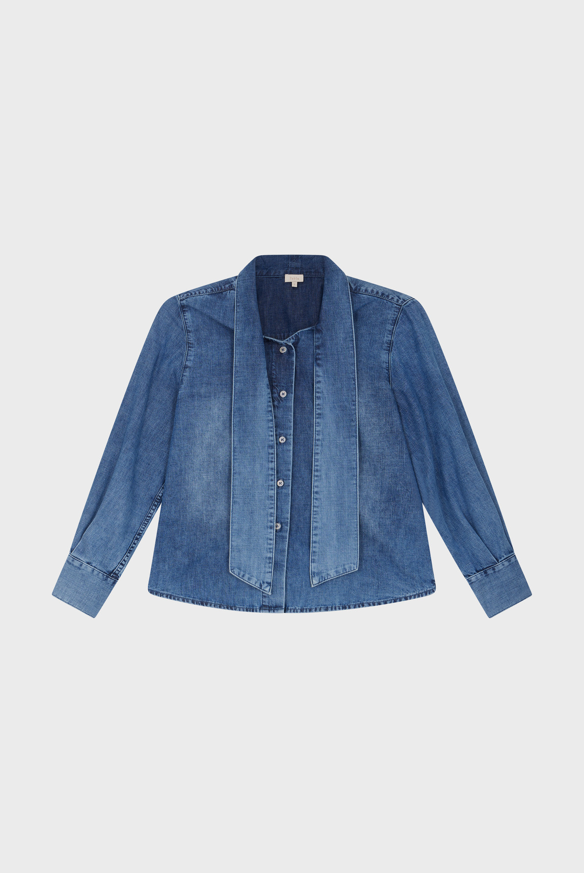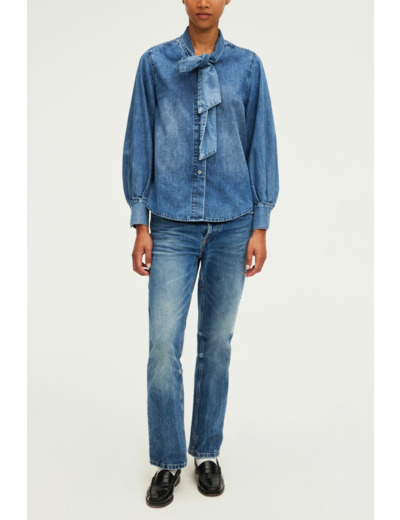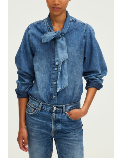Conçue pour s’adapter à toutes les occasions, cette chemise allie confort et sophistication. Le col lavallière apporte une note féminine et originale, tandis que la longueur standard et la forme droite assurent une silhouette équilibrée. Son denim uni, subtilement délavé, offre une texture douce et un rendu visuel unique qui évolue avec le temps.