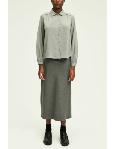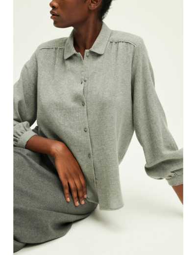 Chemise à coupe droite, laine mélangée unie chinée, longueur standard, col et emmanchure chemise, manches longues, fermeture boutonnée, petits plis à la carrure. La mannequin mesure 177 cm et porte une taille 38.