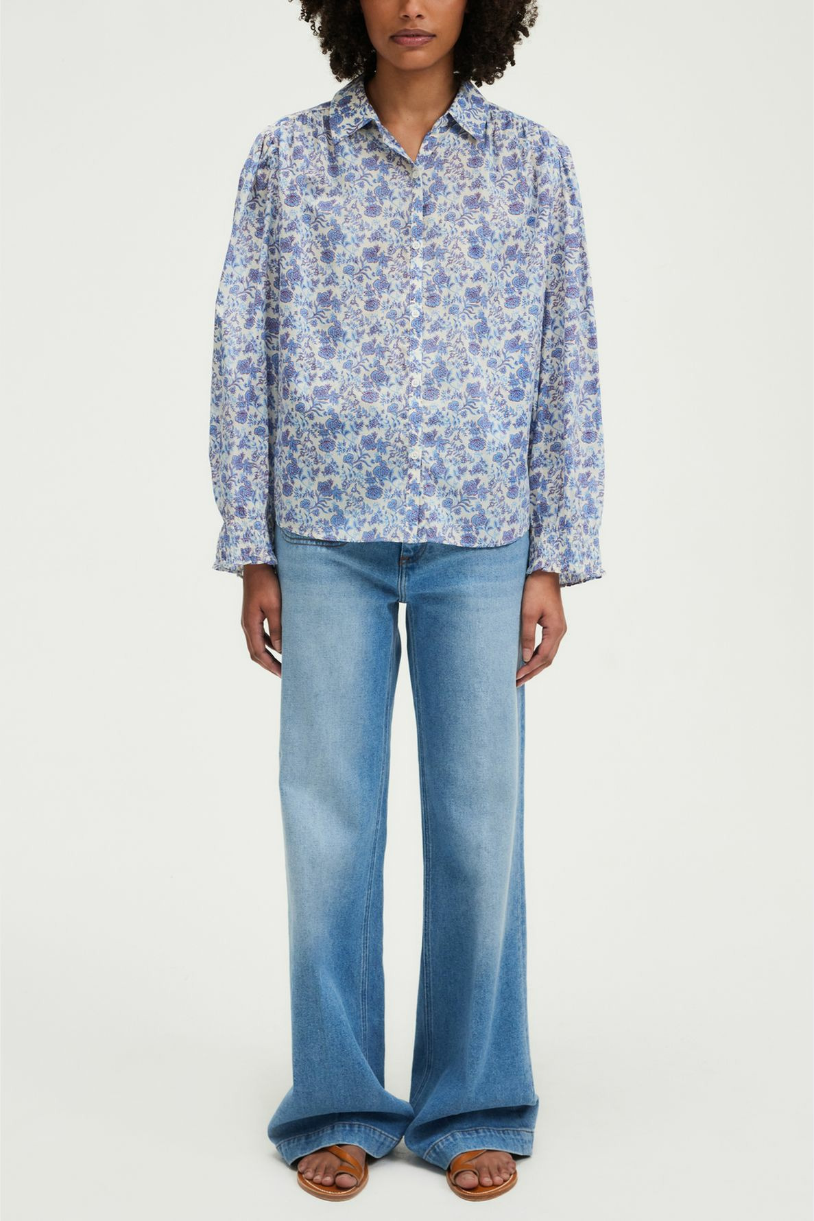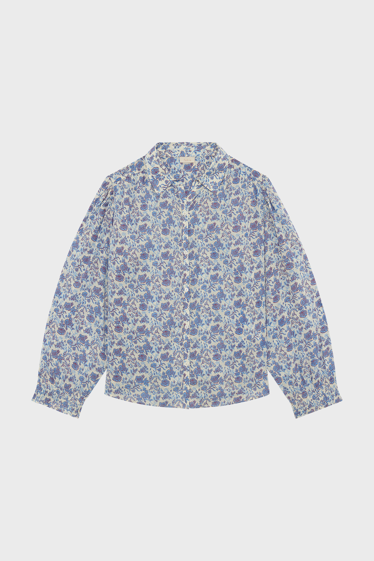 Chemise boutonnée en voile de coton fin, motif floral, forme droite et ample, col chemise, manches longues avec poignets élastiqués smockés, petits plis aux épaules, empiècement plissé dans le dos.