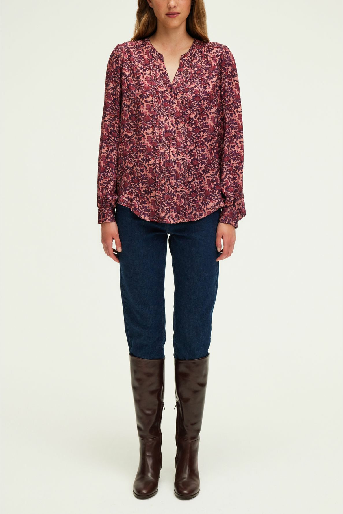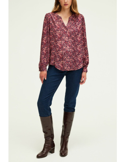 Forme droite, motif floral sur fond jacquard, col rond esprit tunisien, manches longues avec poignets fermés par un bouton rond. Fermeture par boutons ronds sur la patte de boutonnage ornée de plis plats. Fronces aux épaules et dans le dos pour un léger volume. La mannequin mesure 174 cm et porte une taille 38.
