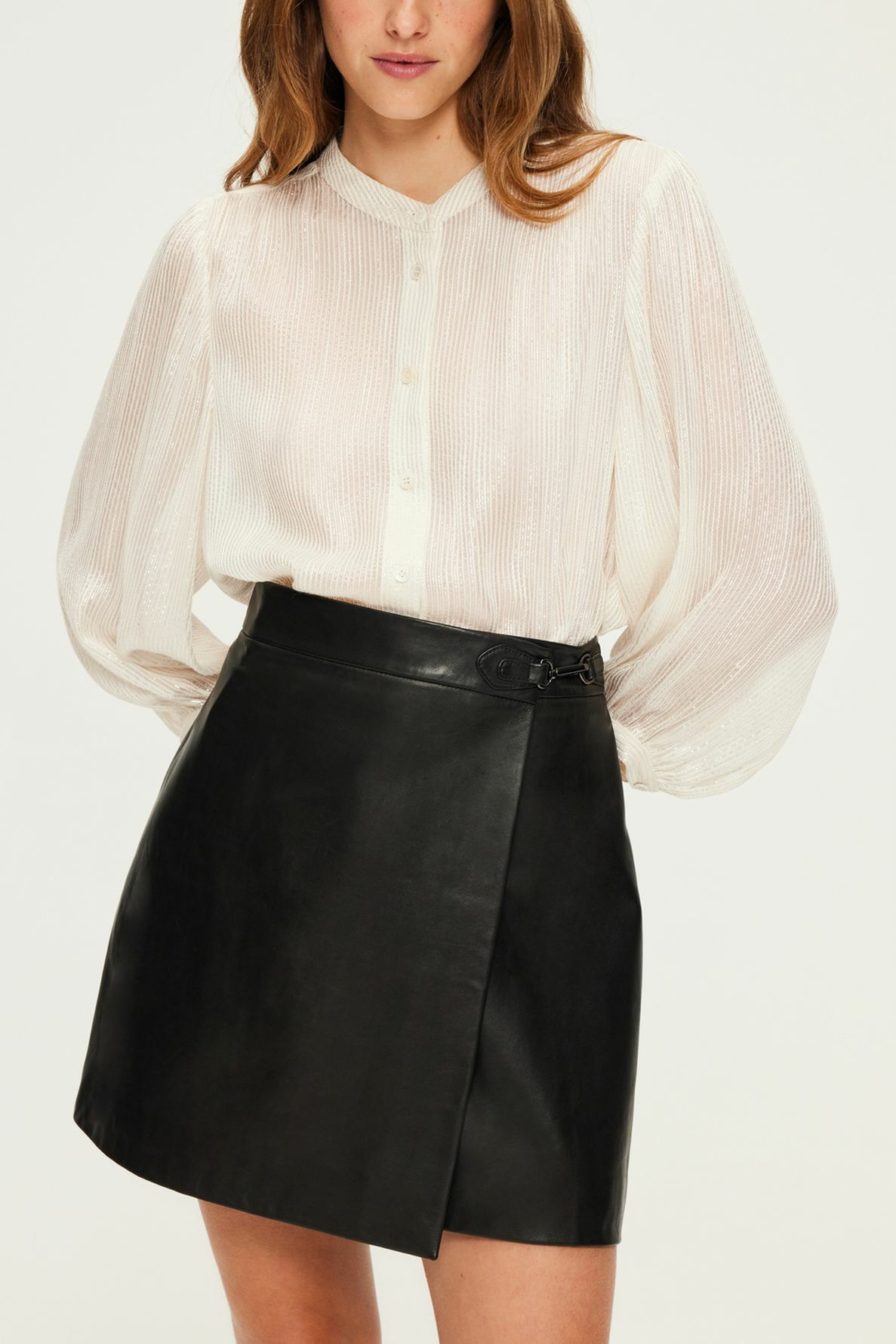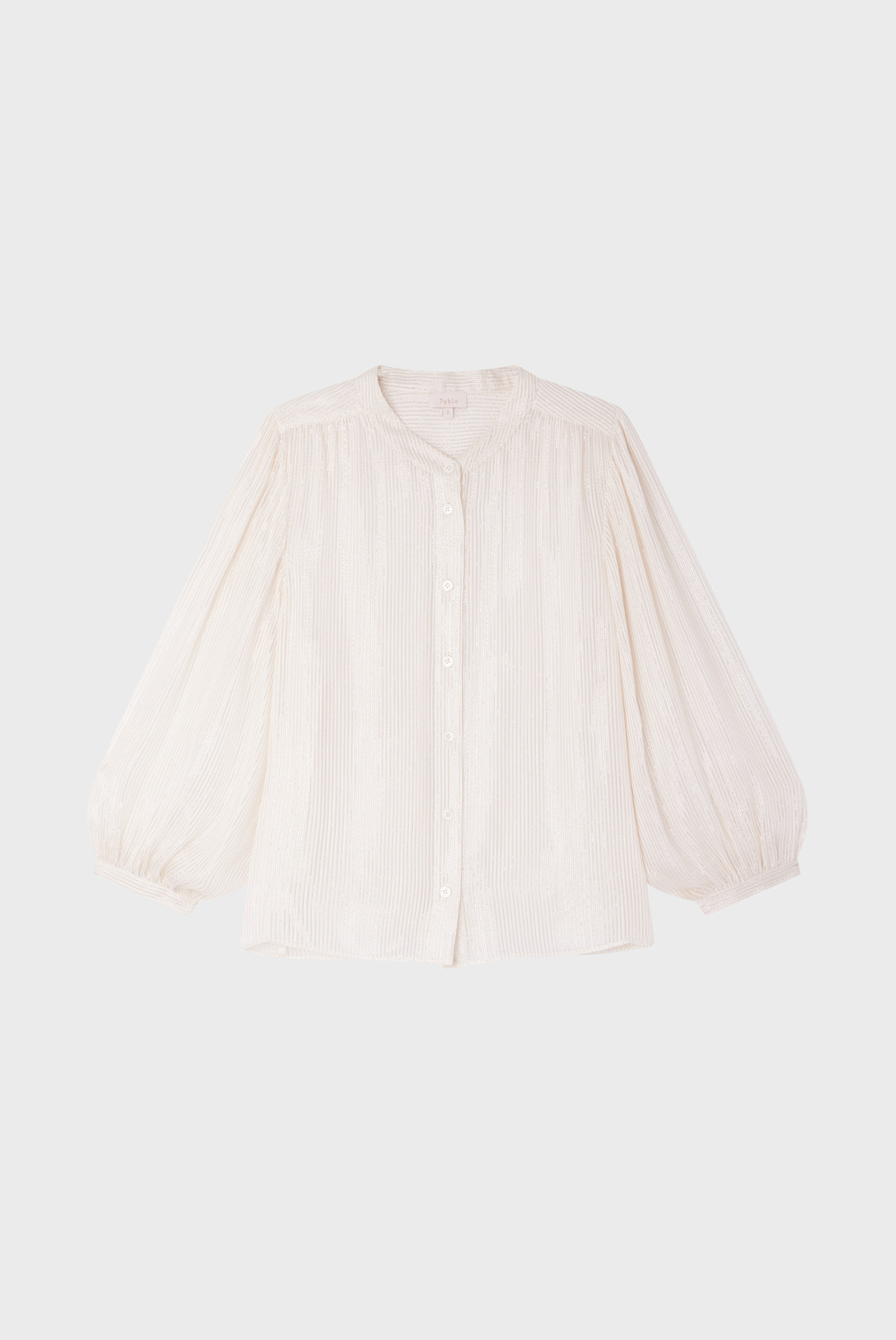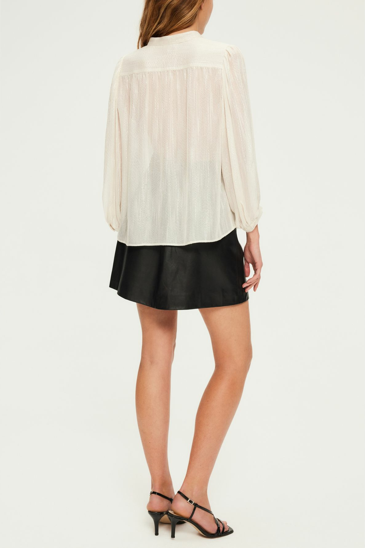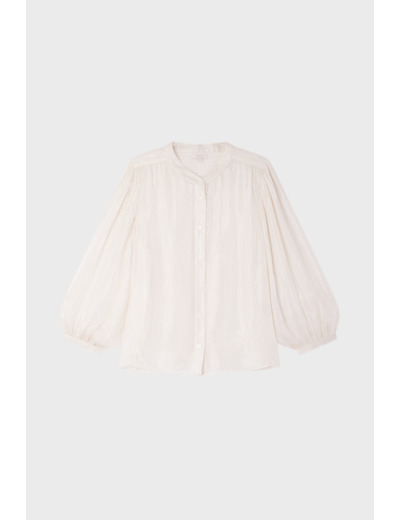 Forme droite, col rond, manches longues avec poignets fermés par un bouton rond. Fermeture par boutons ronds sur le devant. Plis aux épaules, à la carrure, aux poignets et un empiècement plissé dans le dos. Tissu léger mêlant soie et lurex pour un effet transparent et lumineux. La mannequin mesure 174 cm et porte une taille 2.