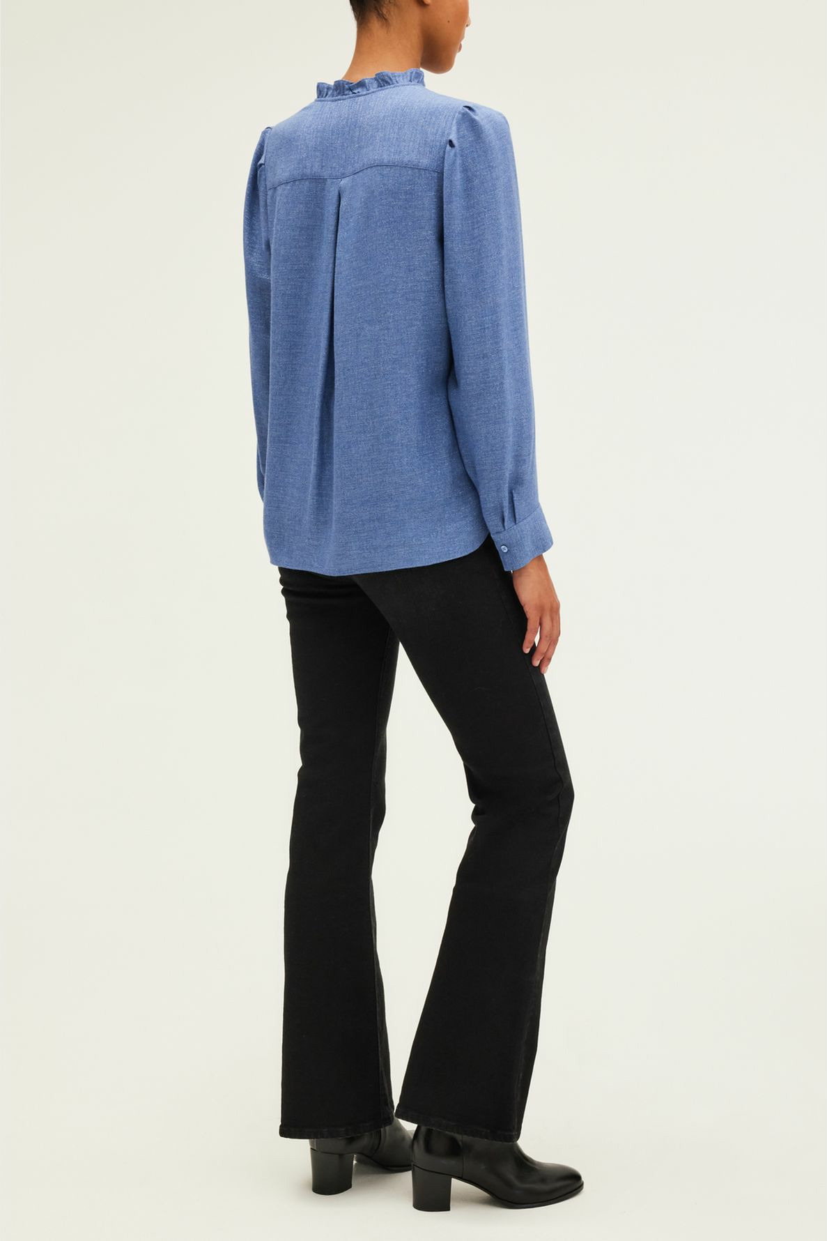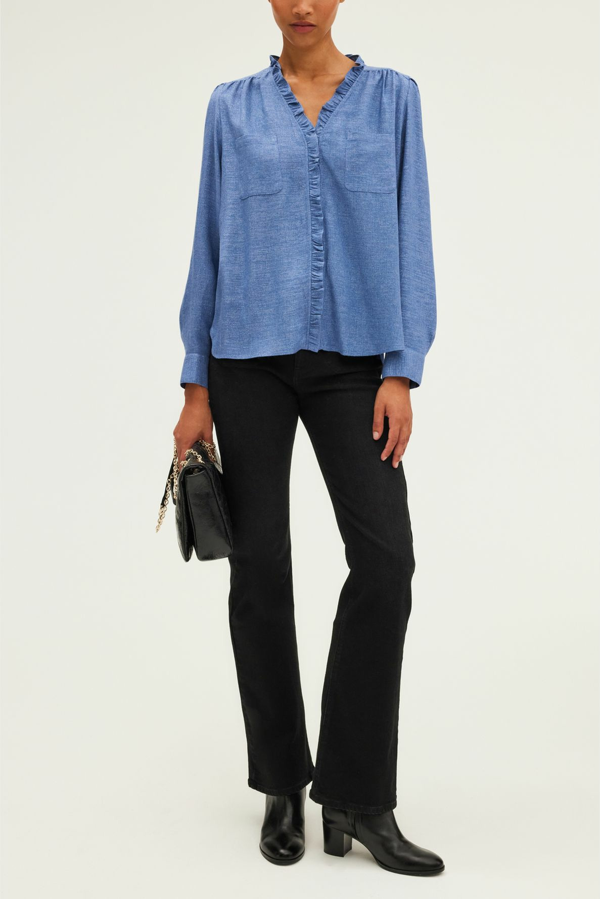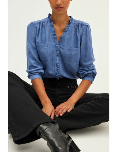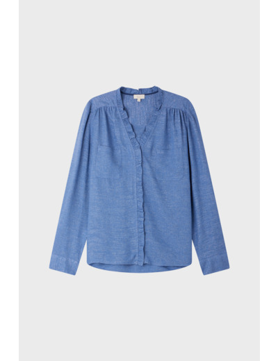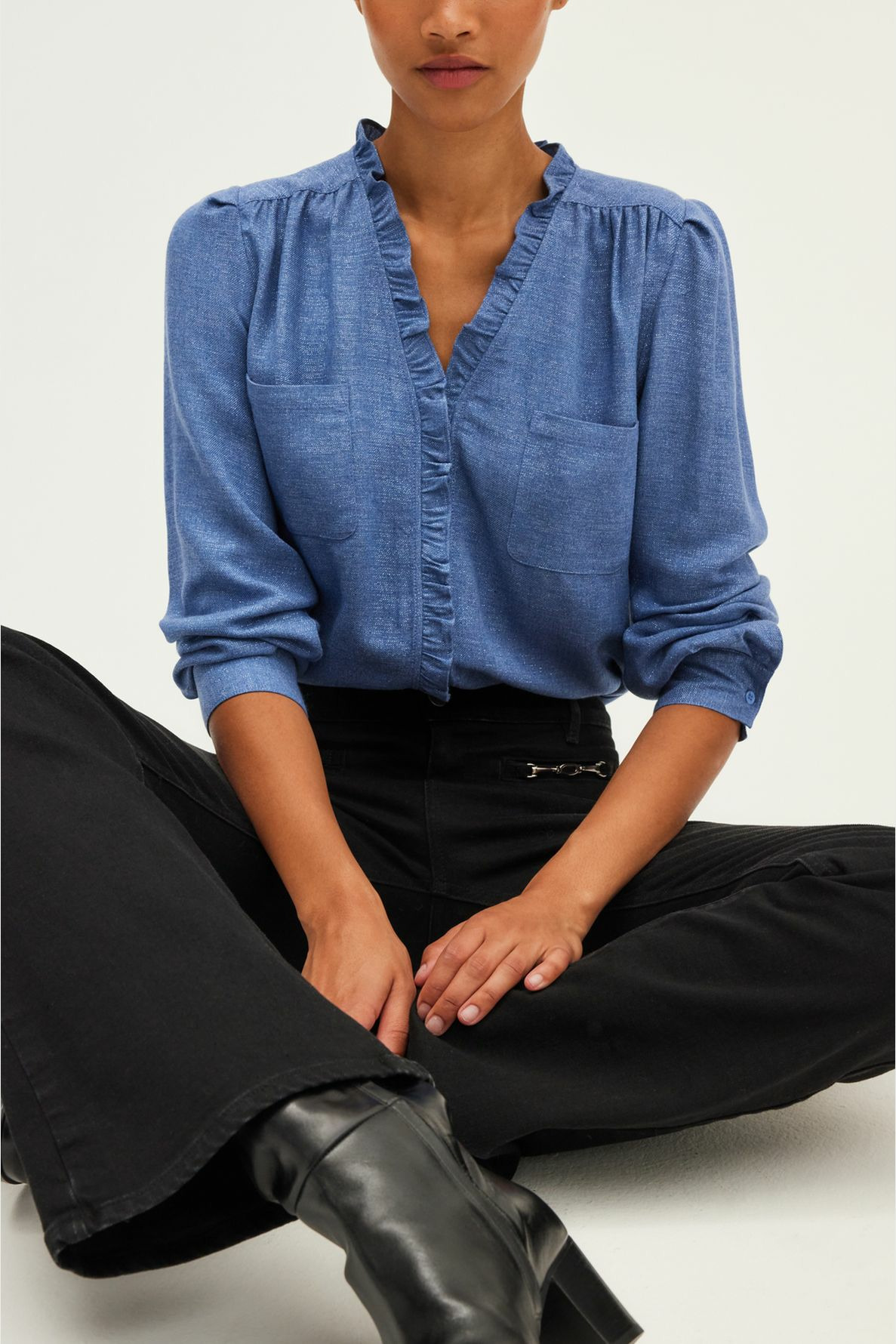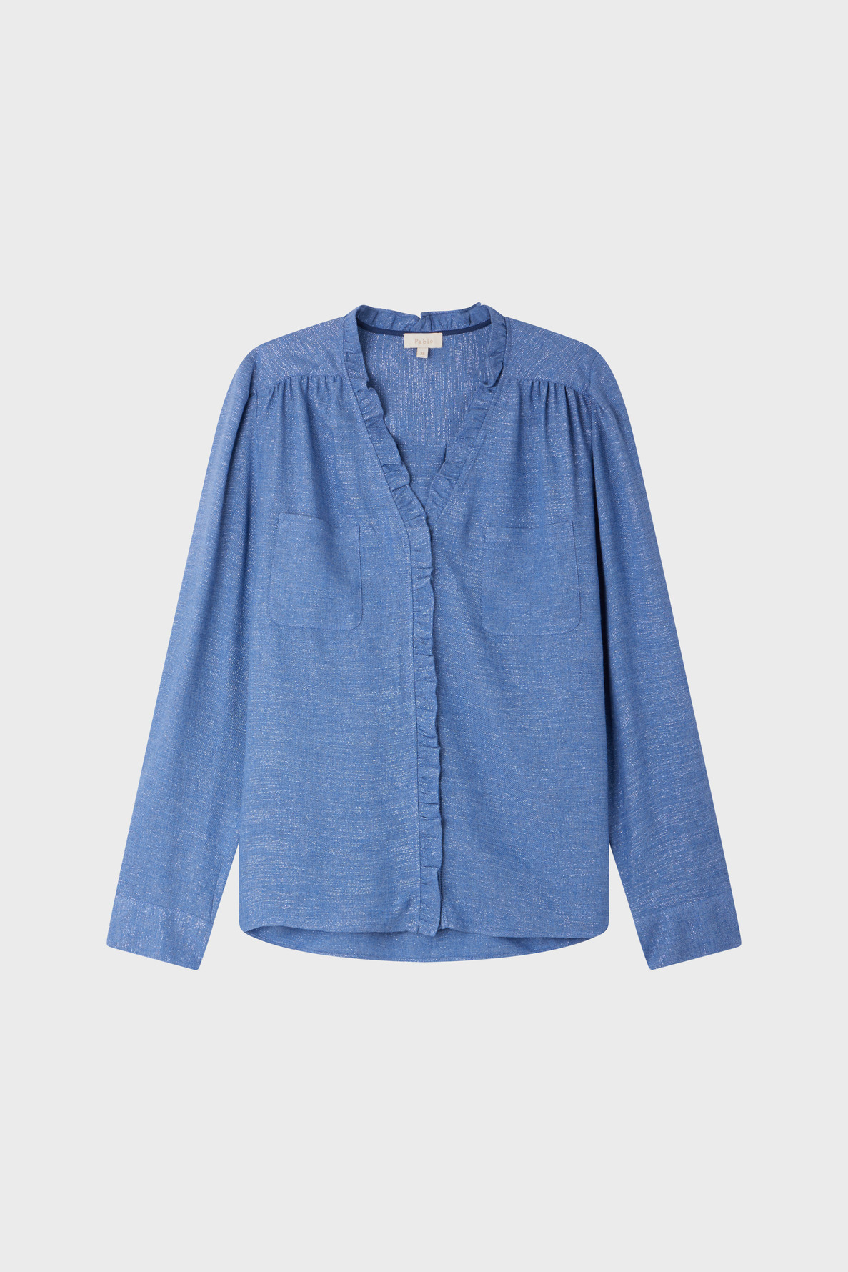 Chemise en tissu lurex uni, coupe ample, col V à volants, manches longues avec poignets boutonnés, fermeture par boutons sous-patte, poches arrondies à la poitrine, volant sur le décolleté et la patte de boutonnage, pli creux dans le dos, fronces sous les épaules, fentes latérales en bas.
