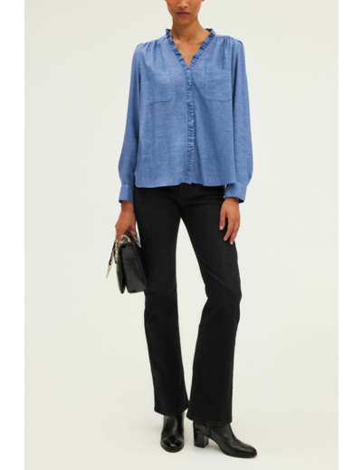 Conçue pour allier confort et style, cette chemise dévoile un col V orné de volants qui souligne le décolleté avec subtilité. Les manches longues, finies par des poignets boutonnés, équilibrent parfaitement la légèreté des volants, tandis que les poches arrondies à la poitrine ajoutent une note pratique et esthétique. Le pli creux dans le dos et les fronces sous les épaules garantissent une tenue fluide et une aisance de mouvement, idéale pour la vie citadine.