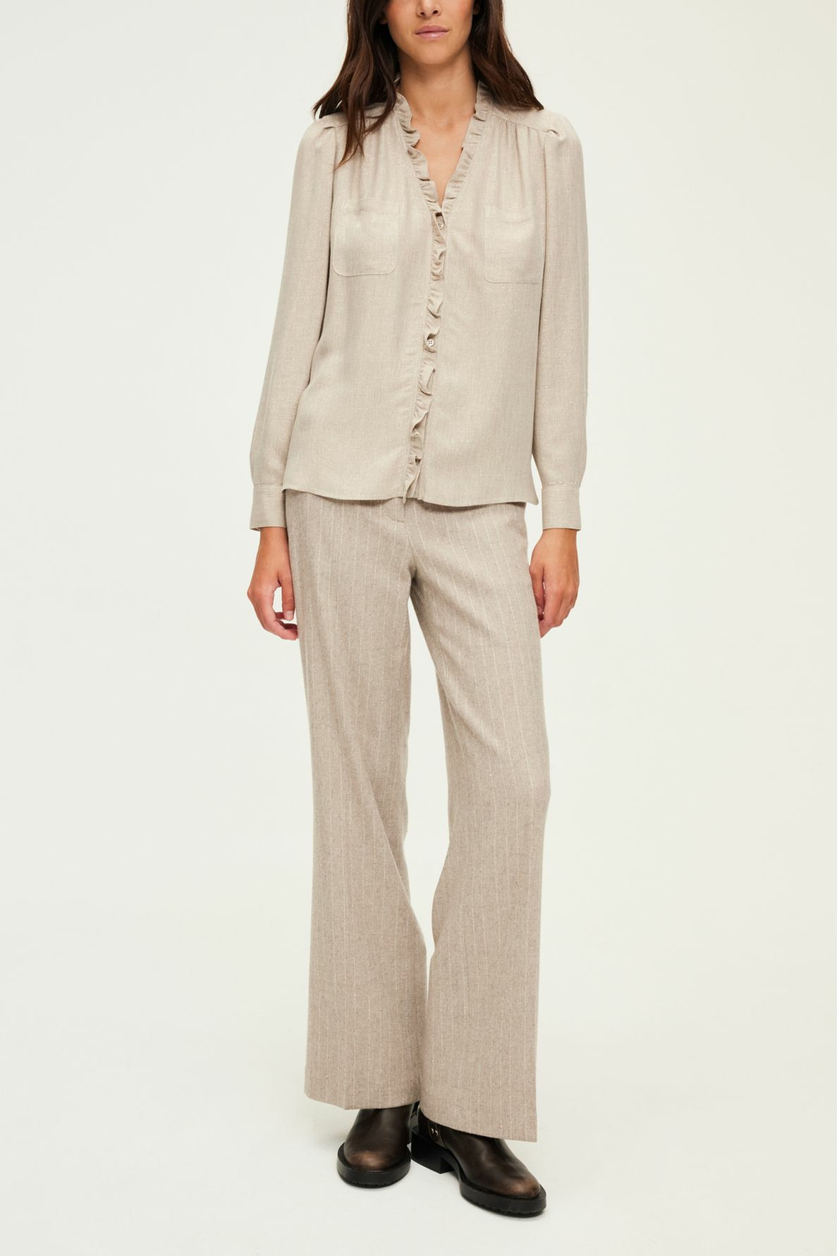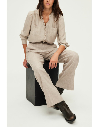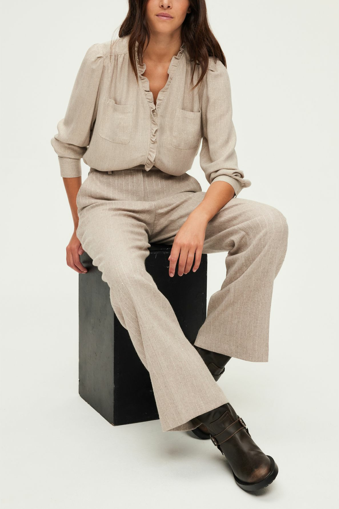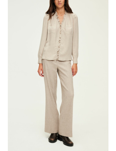 Chemise beige en lurex uni, coupe ample. Col V à volants, manches longues avec poignets fermés par bouton. Fermeture par boutons sous-patte, poches arrondies à la poitrine. Volants ornant le décolleté et la patte de boutonnage. Pli creux dans le dos, fronces sous les épaules. Fentes en bas du produit.