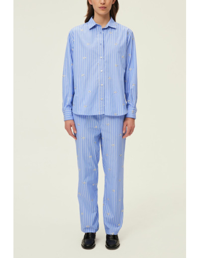 Chemise en popeline rayée avec incrustations de sequins. Coupe droite, longueur standard. Emmanchure basse au niveau des épaules. Col chemise classique. Manches longues avec poignets boutonnés. Fermeture par boutons ronds. La mannequin mesure 175 cm et porte une taille 38.