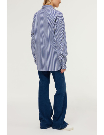 Forme droite, motif à rayures, longueur standard, emmanchure chemise, col chemise, manches longues, poignets avec fente fermée par un bouton, fermeture par boutons ronds, poche plate sur la poitrine, fentes latérales en bas du produit. La mannequin mesure 172 cm et porte une taille 1.