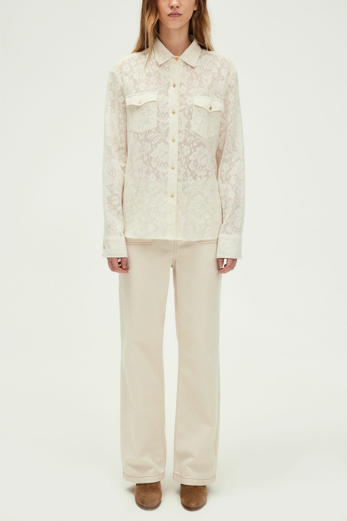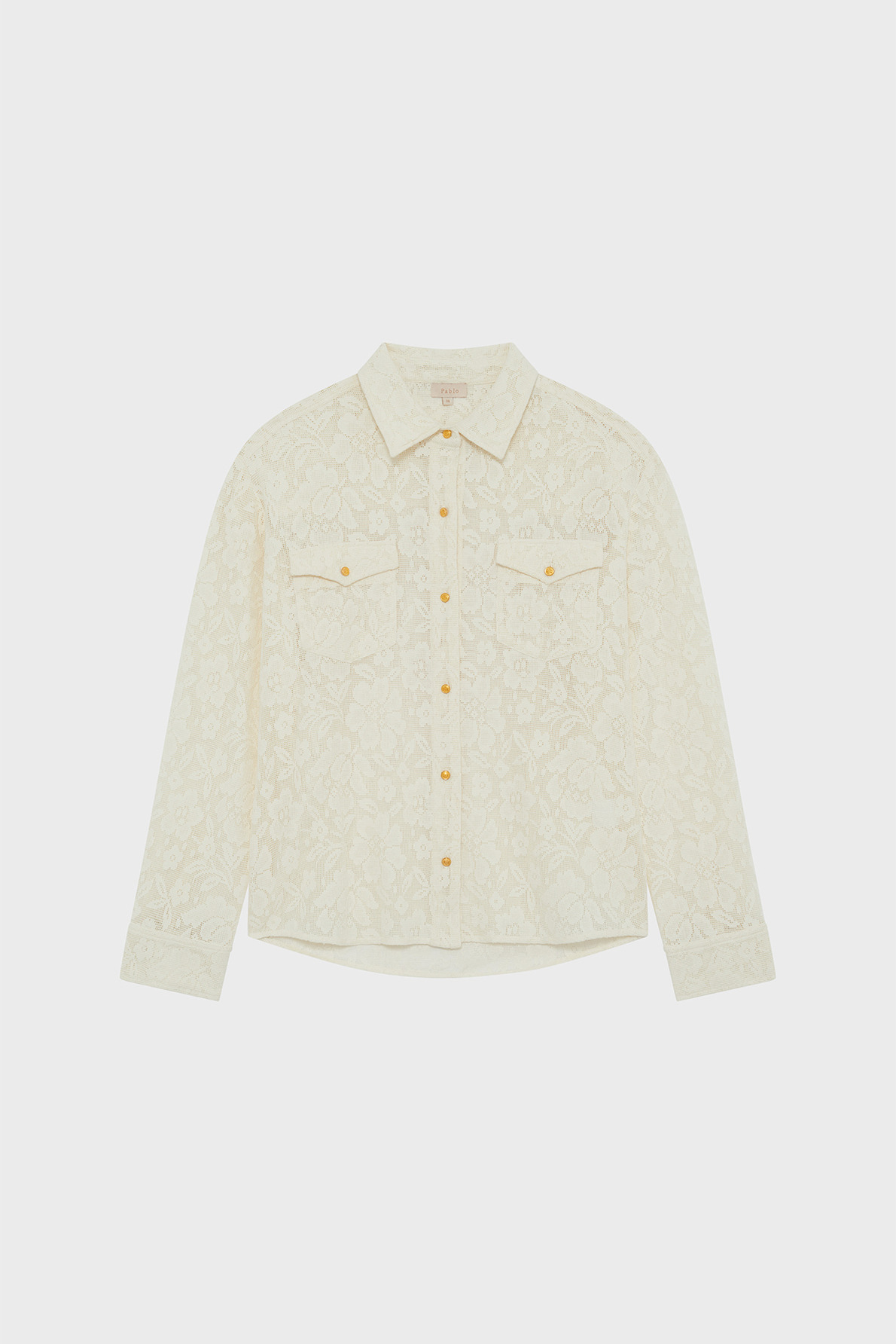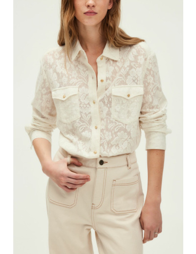 Forme droite, motif floral en dentelle, col chemise fermé par un bouton, manches longues avec poignets à fente et bouton, chemisier boutonné, poches à rabat avec bouton sur la poitrine.