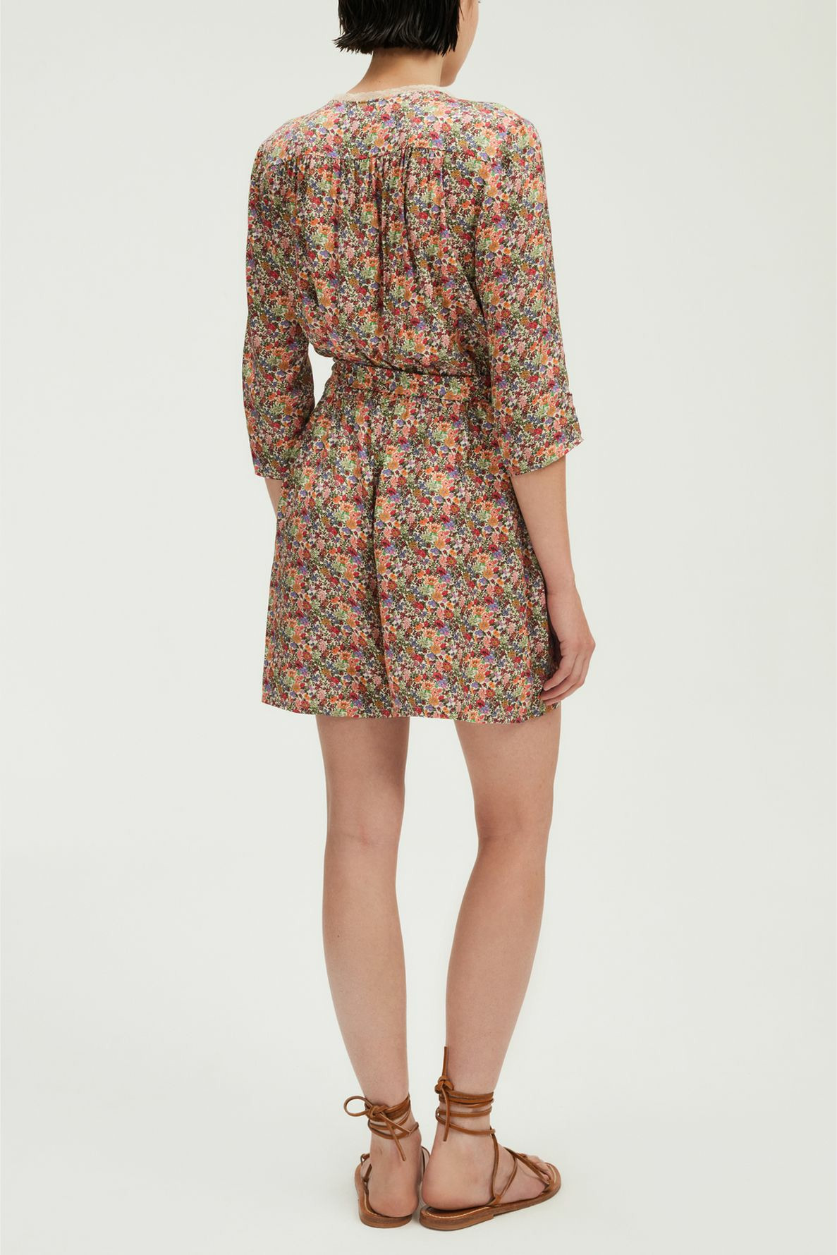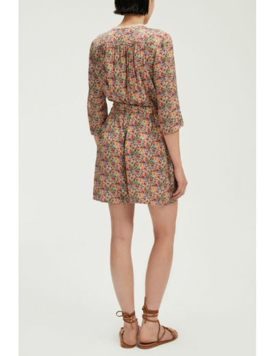 Forme cintrée, motif floral, combinaison courte, col V esprit cache-cœur, manches trois-quarts larges, encolure fermée par bouton pression, taille élastiquée, poches insérées dans la couture, ceinture amovible, plis à la carrure et dans le dos. Matière douce et légèrement satinée.