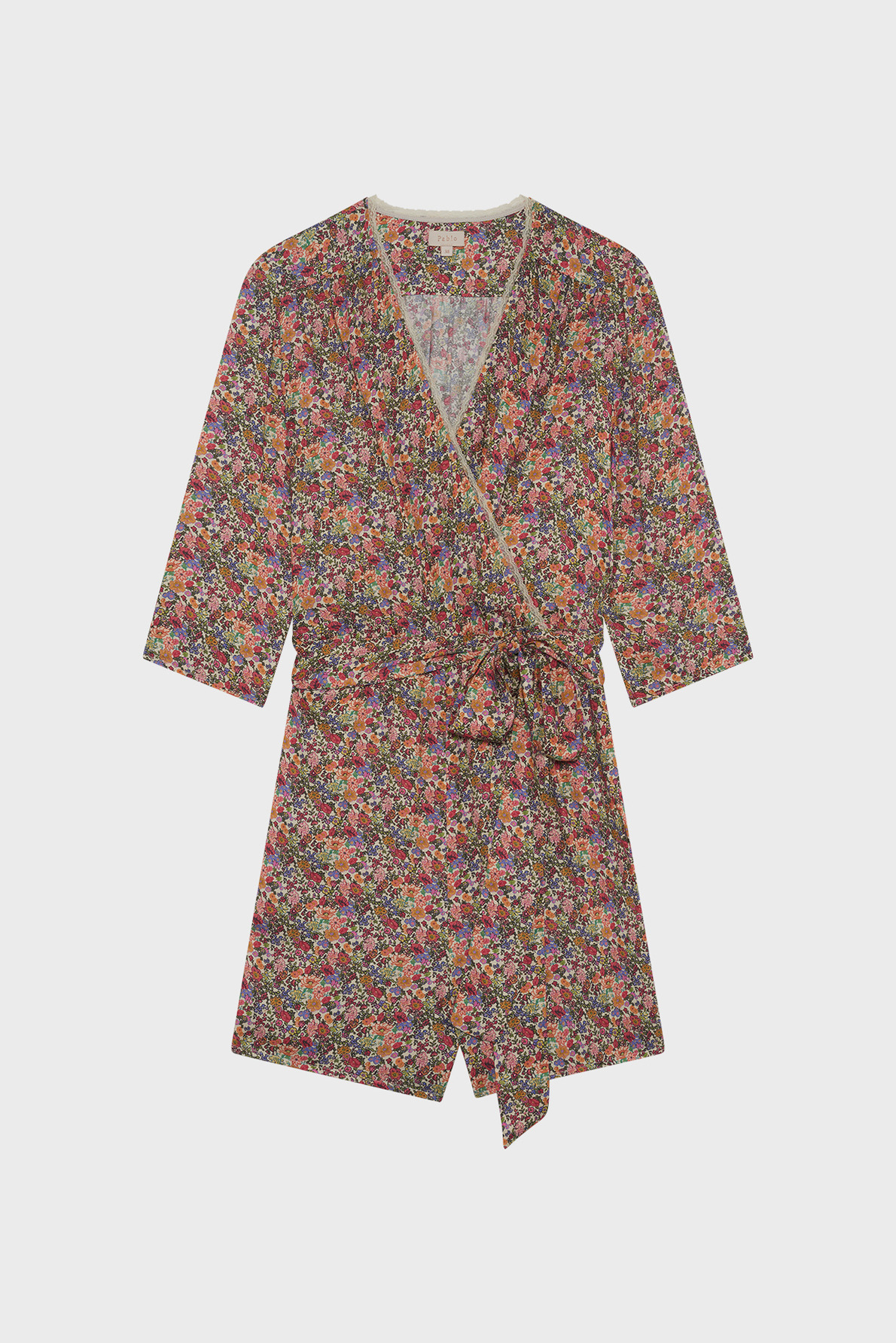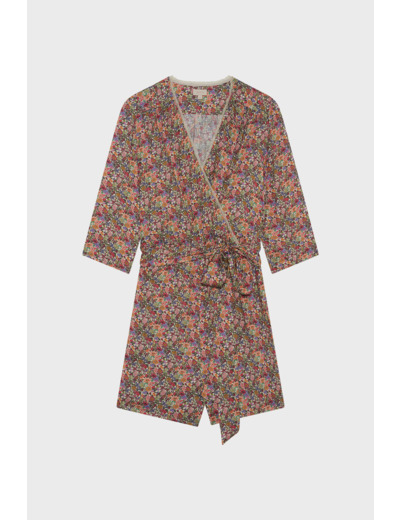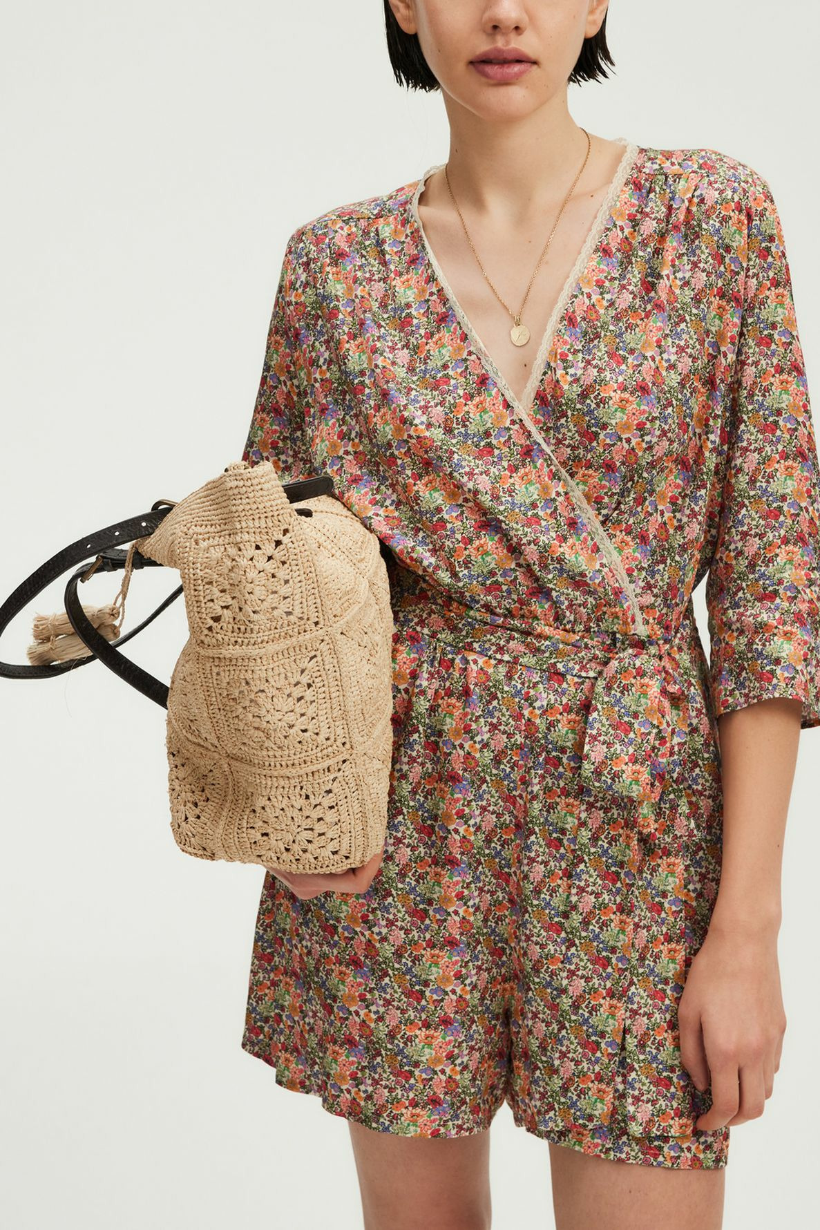 Forme cintrée, combinaison courte à motif floral, col V cache-cœur avec dentelle, manches 3/4 larges, taille élastiquée avec ceinture amovible, poches insérées, plis à la carrure et dans le dos, matière douce légèrement satinée, fermeture par bouton pression au col.