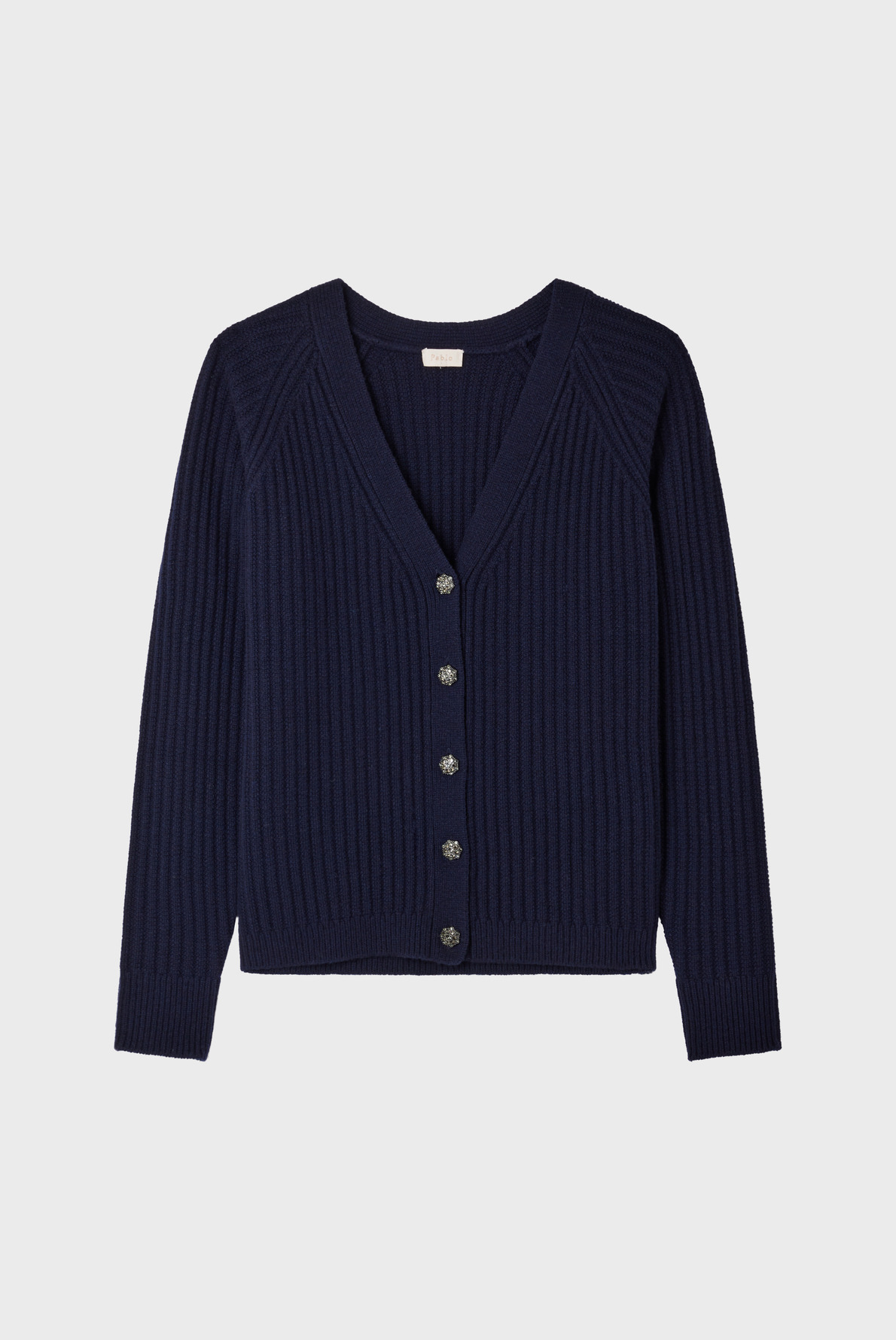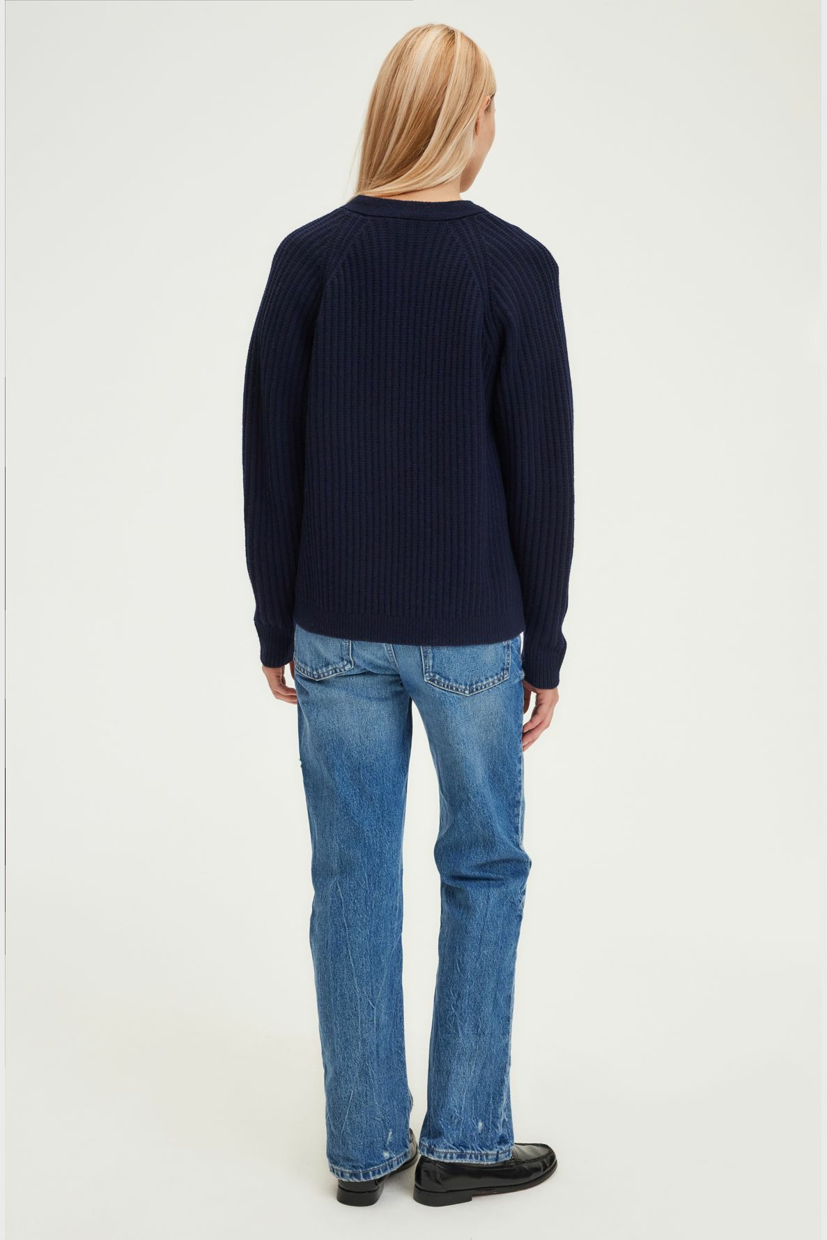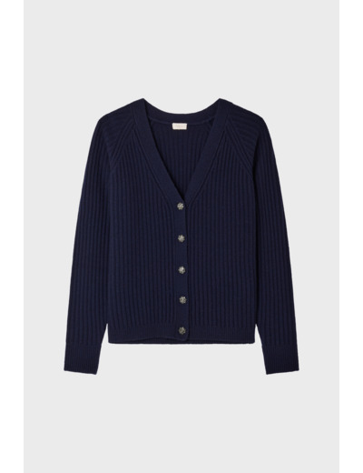 100% laine. Forme droite et ample. Laine unie à côtes. Emmanchure raglan. Col V. Manches longues. Jeux de maille. Finitions bords-côtes. La mannequin mesure 174 cm et porte une taille 2.