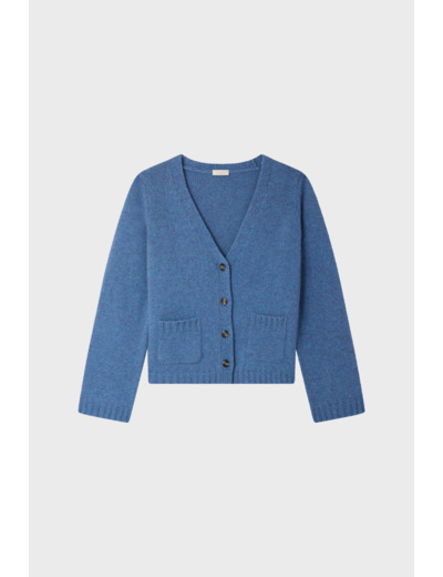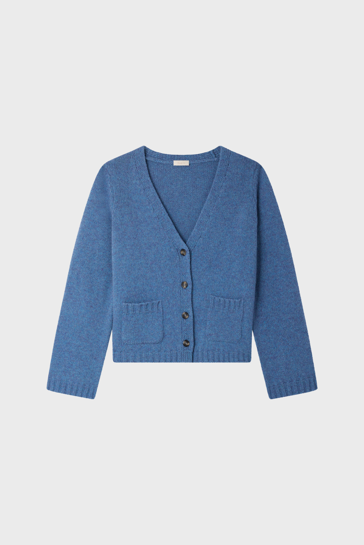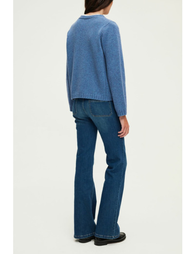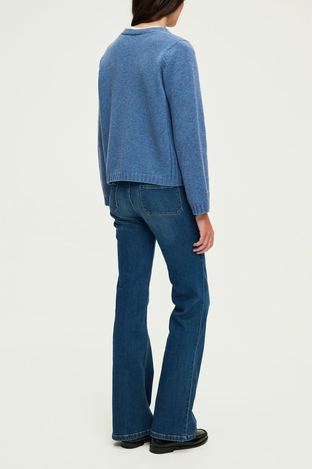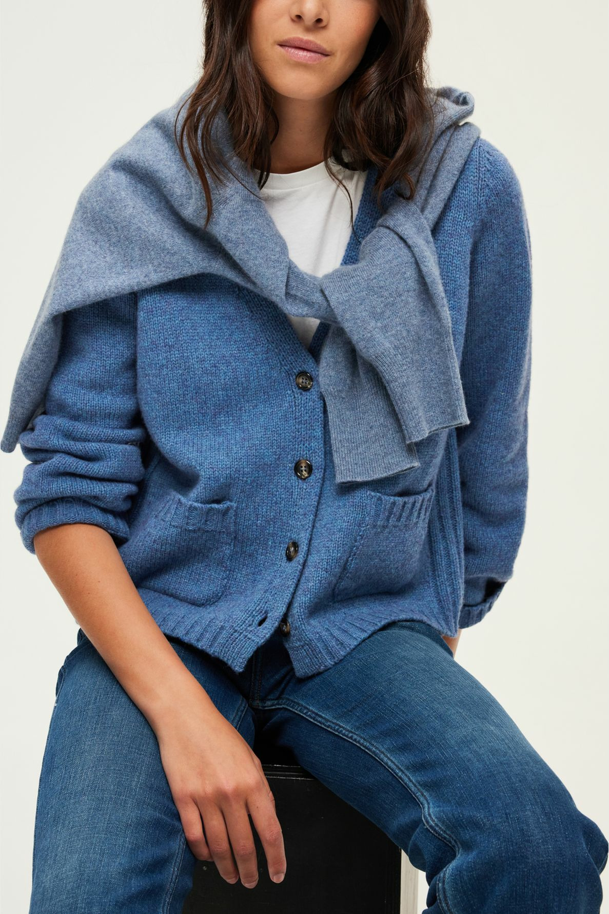 Fabriqué en Italie avec une laine mélangée chinée dans des tons de bleu, ce gilet présente une forme droite et courte, manches longues, poches plates arrondies, finitions bord-côtes, jeux de côtes latéraux et une matière stretch pour un confort et une tenue irréprochables.