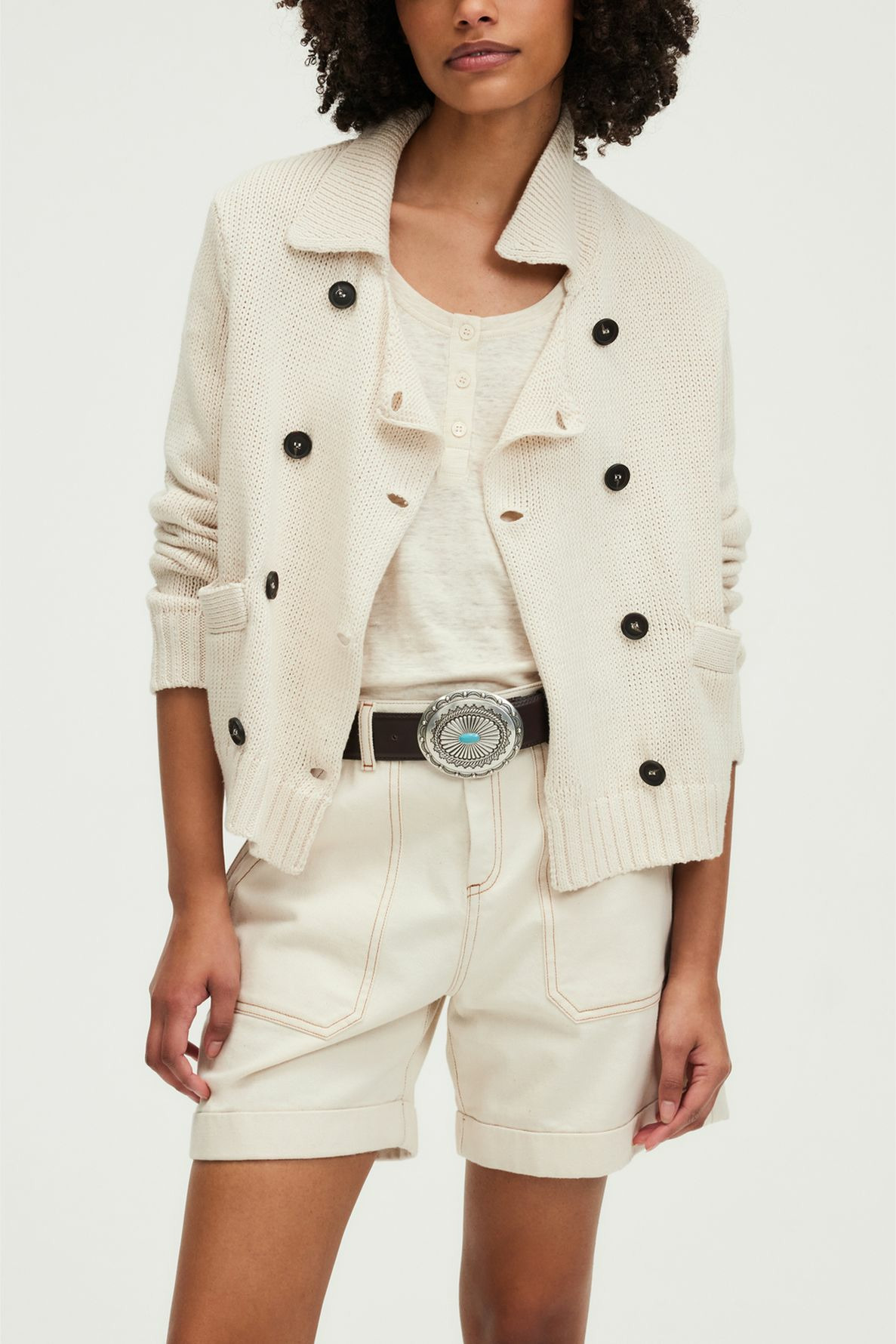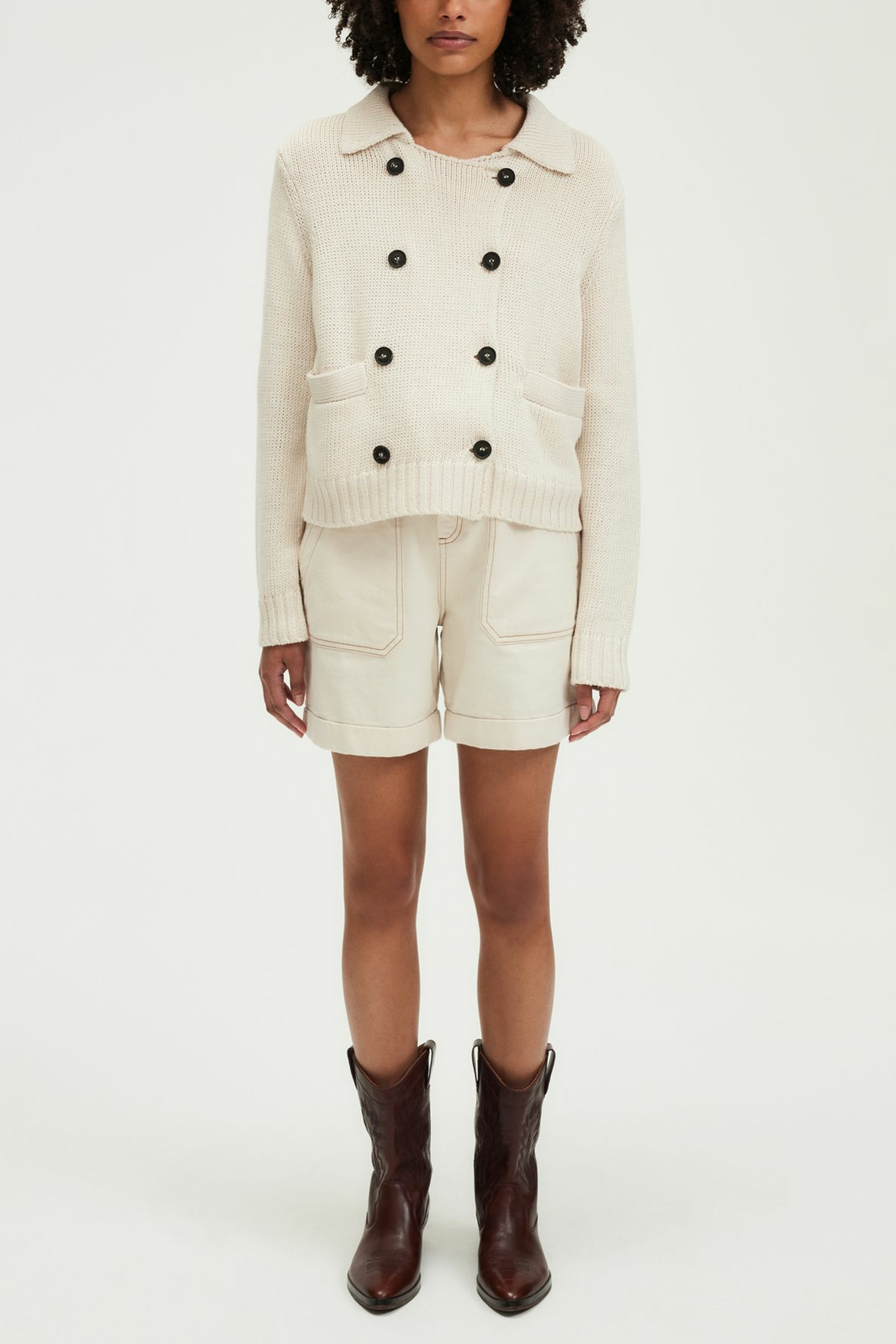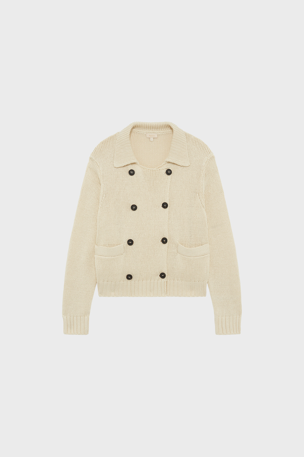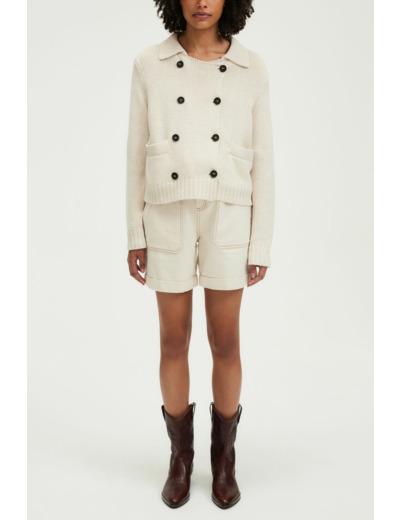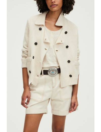 Matière : mélange lin et coton. Forme droite. Boutonnage croisé. Col polo pouvant se porter ouvert. Manches longues. Maille unie et stretch. Longueur standard. Poches plates passepoilées. Finitions bord-côtes.