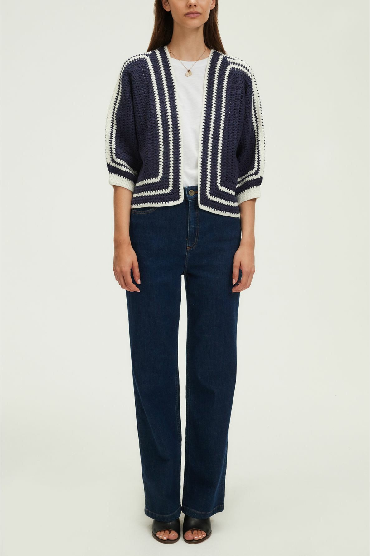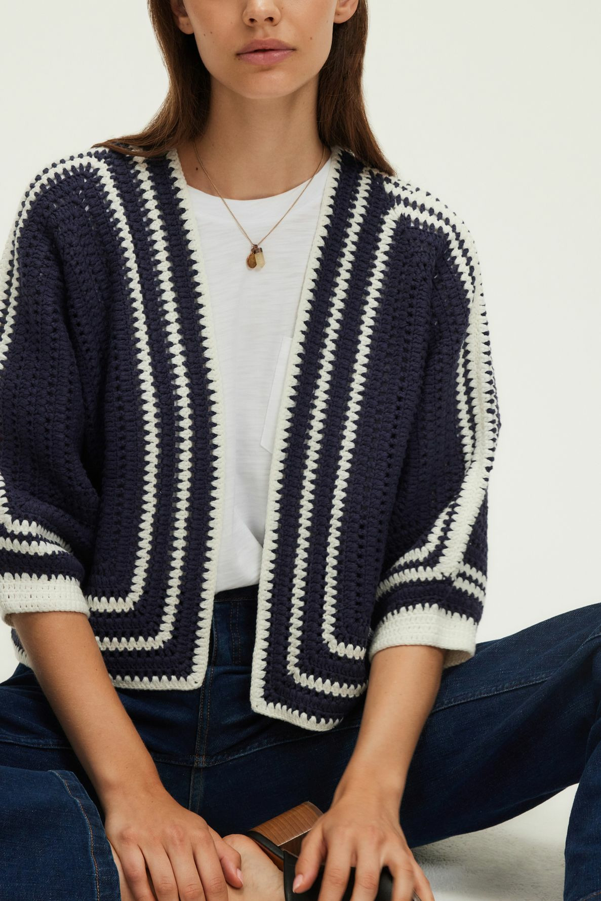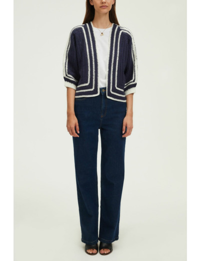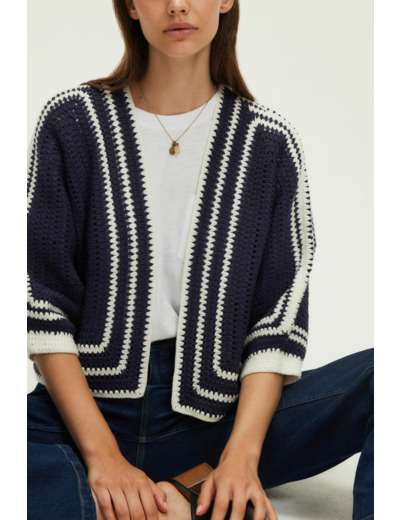 Tricoté en coton mélangé, ce gilet présente une maille crochet bicolore, une forme droite, une longueur courte, un col sans finition, des manches 7/8, et un bord à bord sans fermeture.