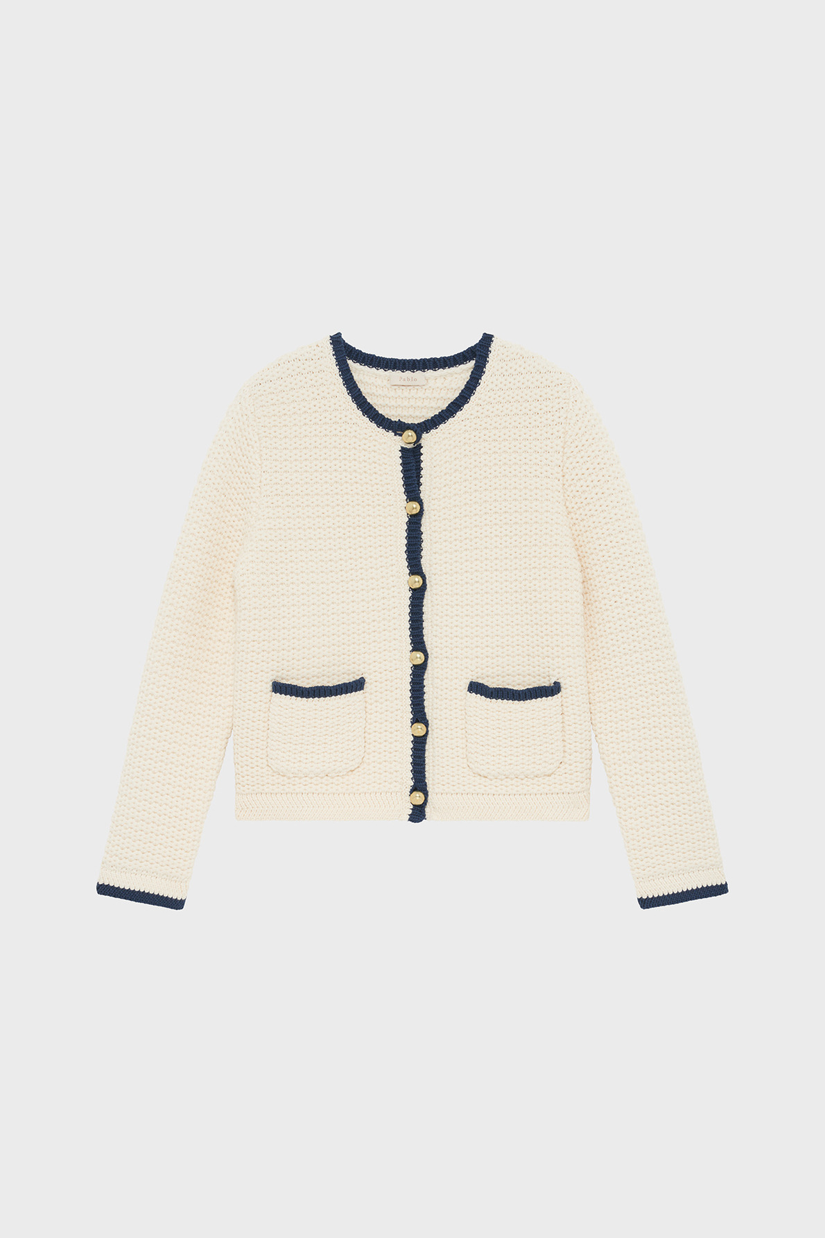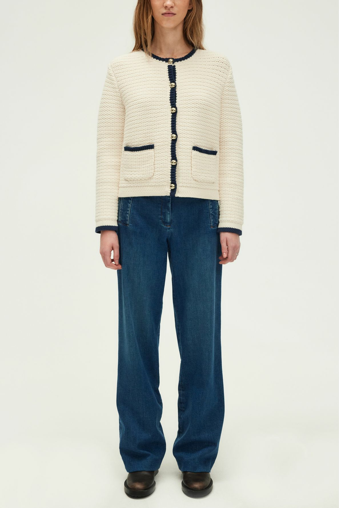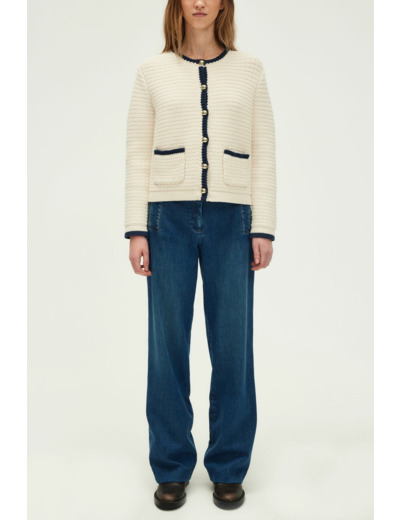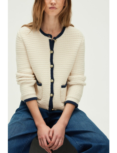 Forme droite, maille unie et stretch, longueur standard, sans col, manches longues, gilet boutonné avec boutons ronds dorés. Poches arrondies à la taille. Jeu de mailles obliques dans le bas des manches et du gilet. Matière : coton mélangé.