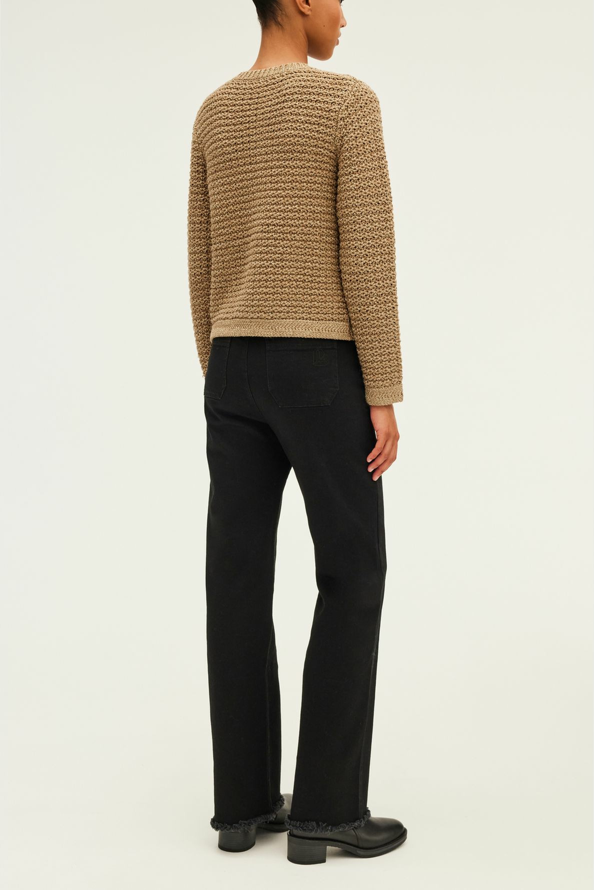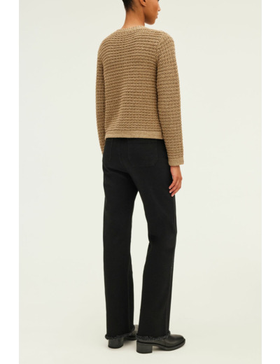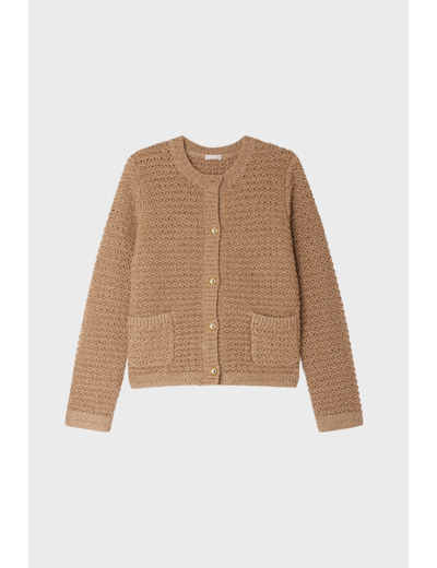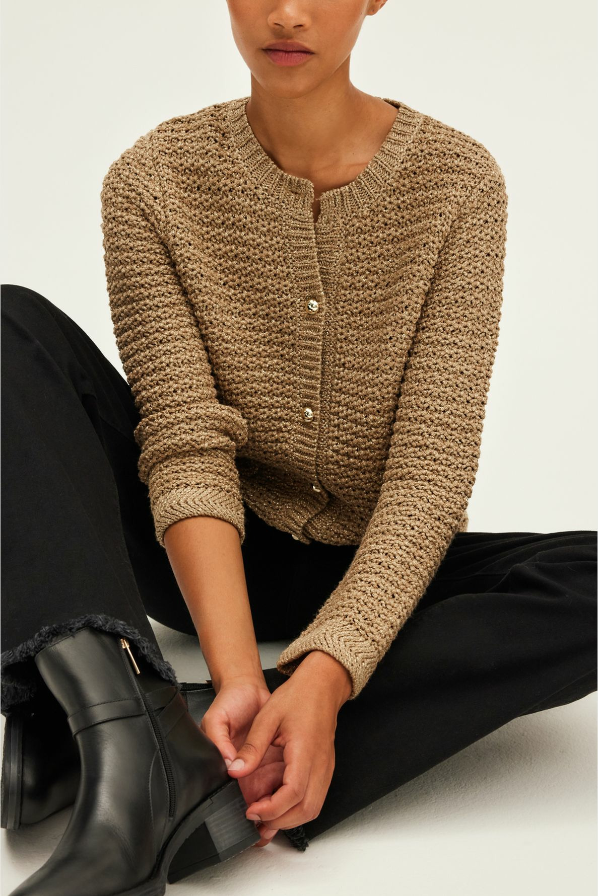 Maille épaisse dorée avec lurex, coupe droite, gilet court à col rond, manches longues, fermeture par boutons dorés, deux poches plates à la poitrine, finitions bords-côtes avec jeux de maille. La mannequin mesure 180 cm et porte une taille 2.