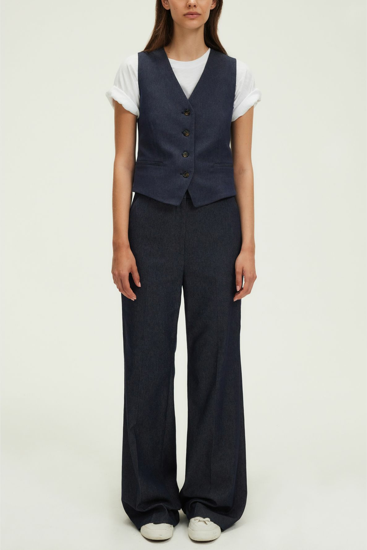 Adoptez l’élégance décontractée avec ce gilet de tailleur sans manche en coton mélangé, inspiré du denim. Une pièce clé pour affirmer une silhouette moderne et structurée, à porter seule ou en total look avec le pantalon assorti.