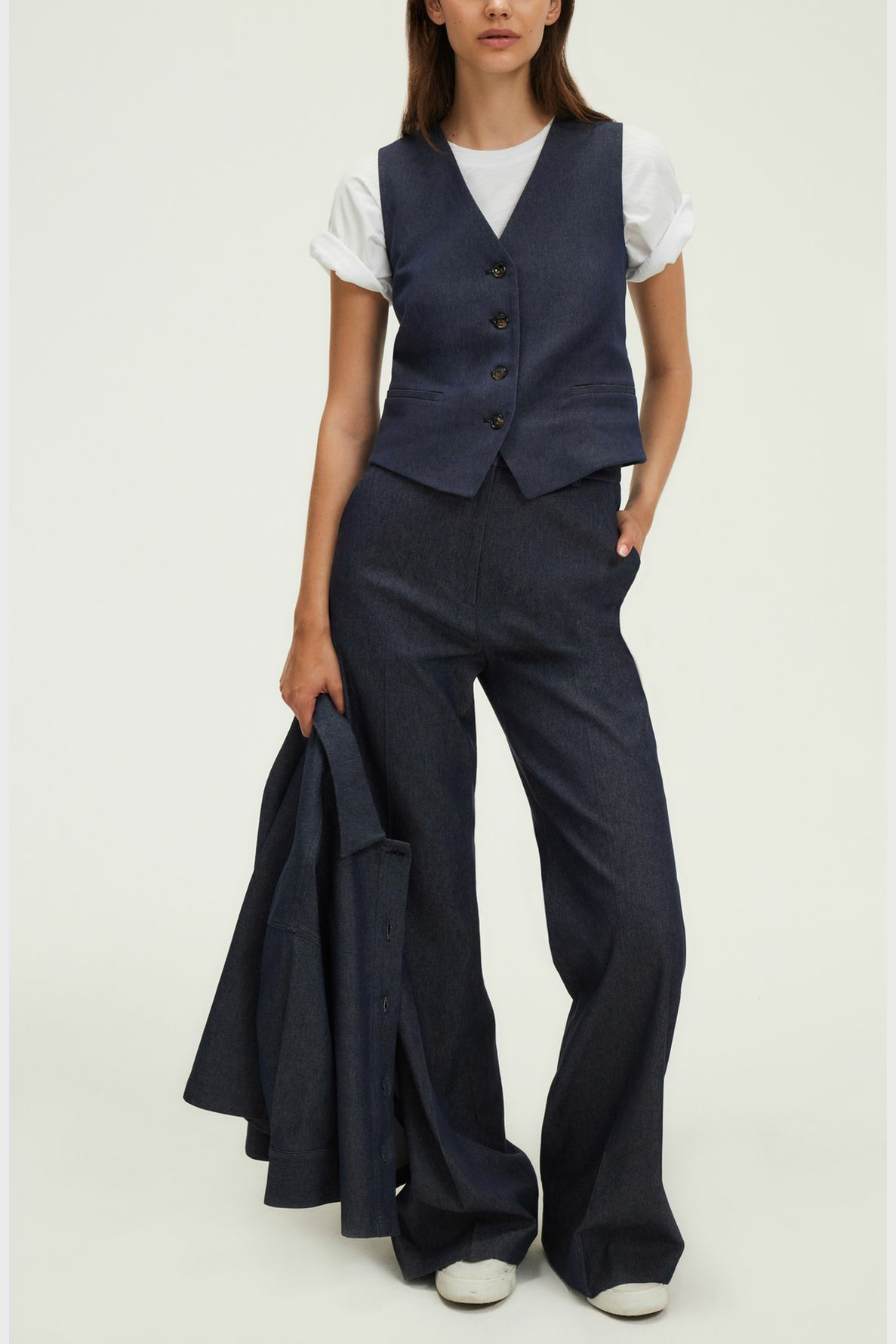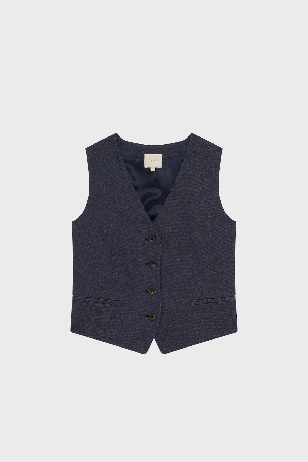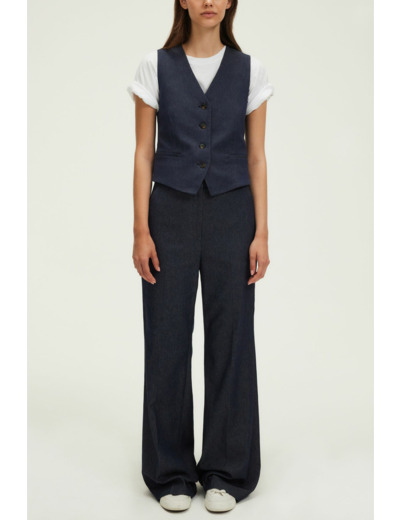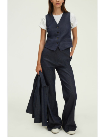 Forme cintrée, denim uni, gilet court avec col V décolleté, sans manche. Fermeture par quatre boutons esprit corne. Deux poches passepoilées à la taille. Sangle de serrage avec boucle dans le dos. Pans en pointe devant pour un effet allongeant.