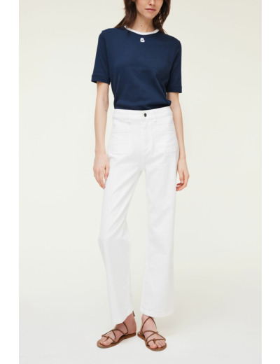 Jean blanc en coton uni légèrement stretch, taille haute, jambes larges et coupe droite. Fermeture avec zip sous patte et bouton rond. Deux grandes poches devant, deux poches au dos. Ceinture montée à passants. Longueur pantalon standard. La mannequin mesure 180 cm et porte une taille 38.