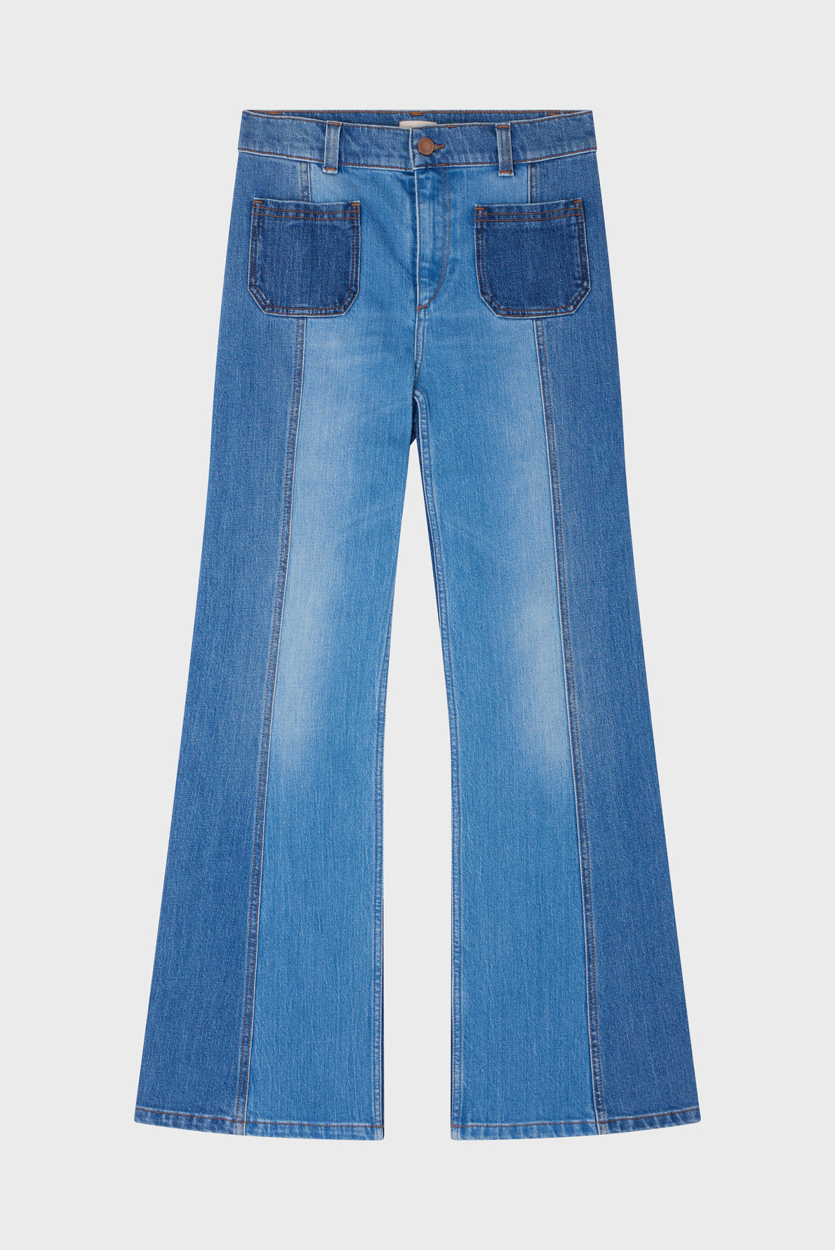 Affirmez votre style avec ce jean flare bicolore, alliant audace graphique et charme vintage. Sa coupe taille haute et ses jambes évasées sculptent la silhouette avec élégance.
