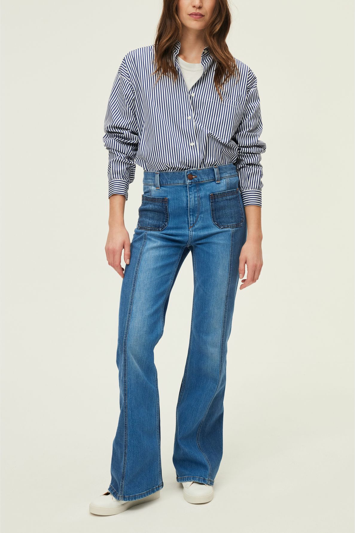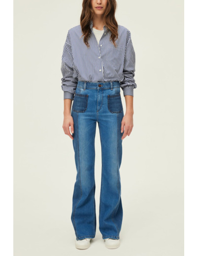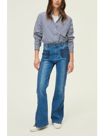 Taille haute, jambes évasées, ceinture montée à passants, fermeture par bouton et zip sous patte. Jean uni bicolore en matière légèrement stretch. Poches plaquées devant et dos. Doubles surpiqûres contrastées. Longueur pantalon. La mannequin mesure 175 cm et porte une taille 38. En cas de doute entre deux tailles, privilégiez la taille inférieure.