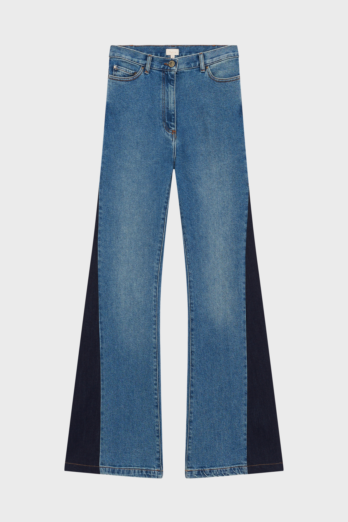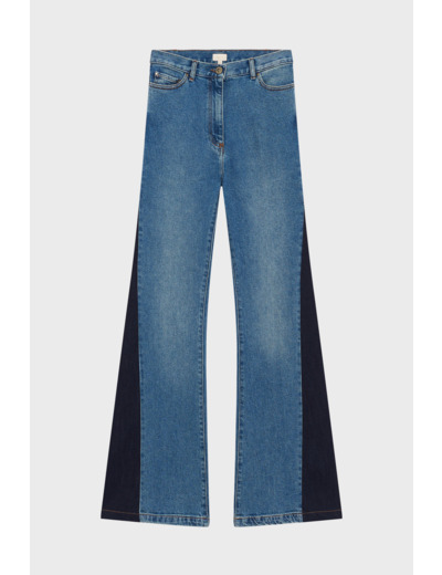 Jean flare Pablo avec bandes obliques en coloris brut sur les côtés. Denim uni bicolore. Pantalon long. Fermeture par bouton gravé et zip sous patte. Coupe flare. Modèle cinq poches. Rivets métalliques.