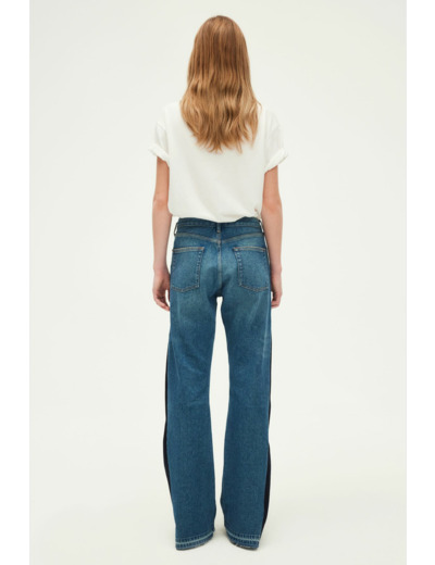 Comment entretenir ce pantalon en denim bicolore ? Il est recommandé de laver à froid et de préférer un séchage à l’air libre pour préserver les couleurs et la matière.