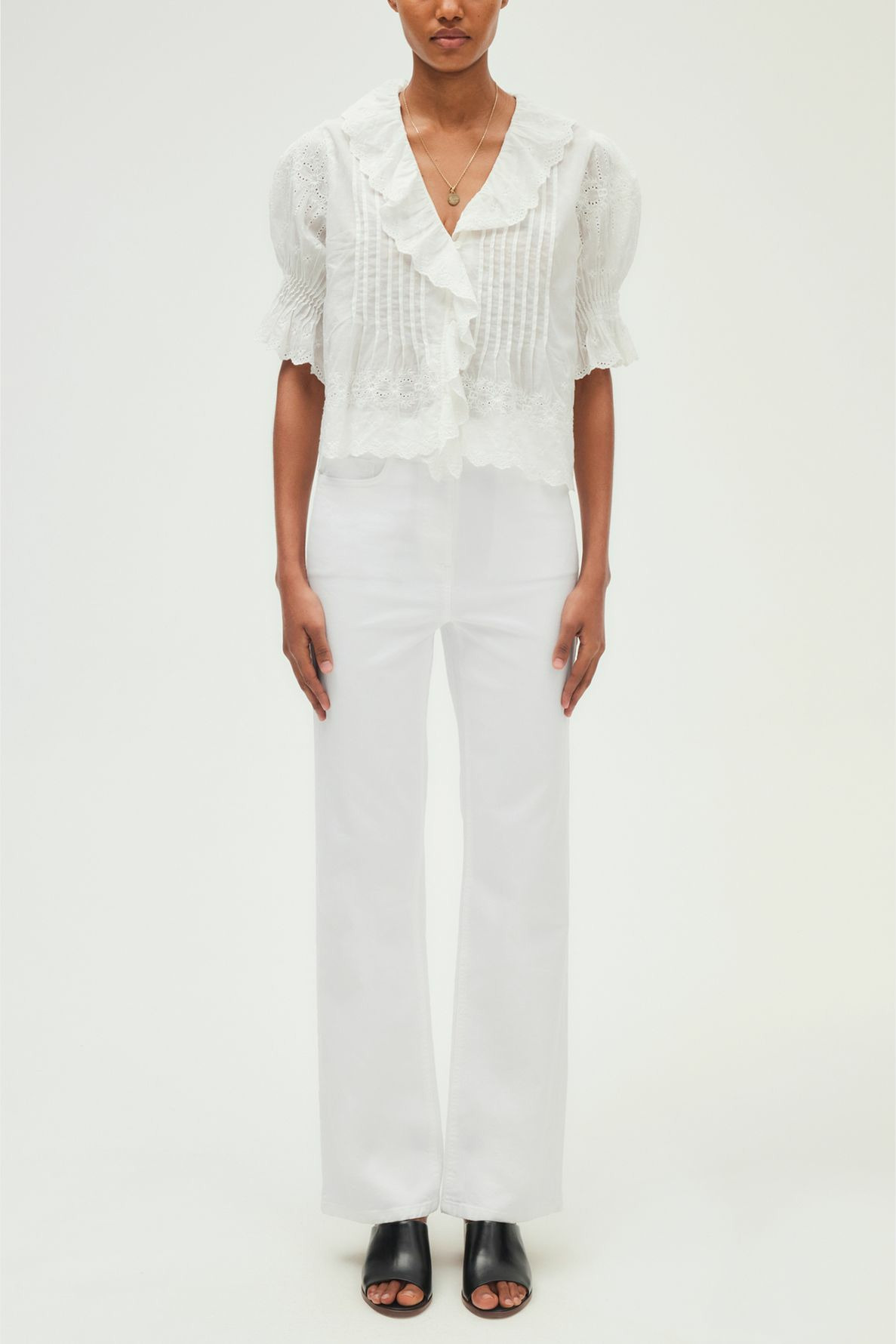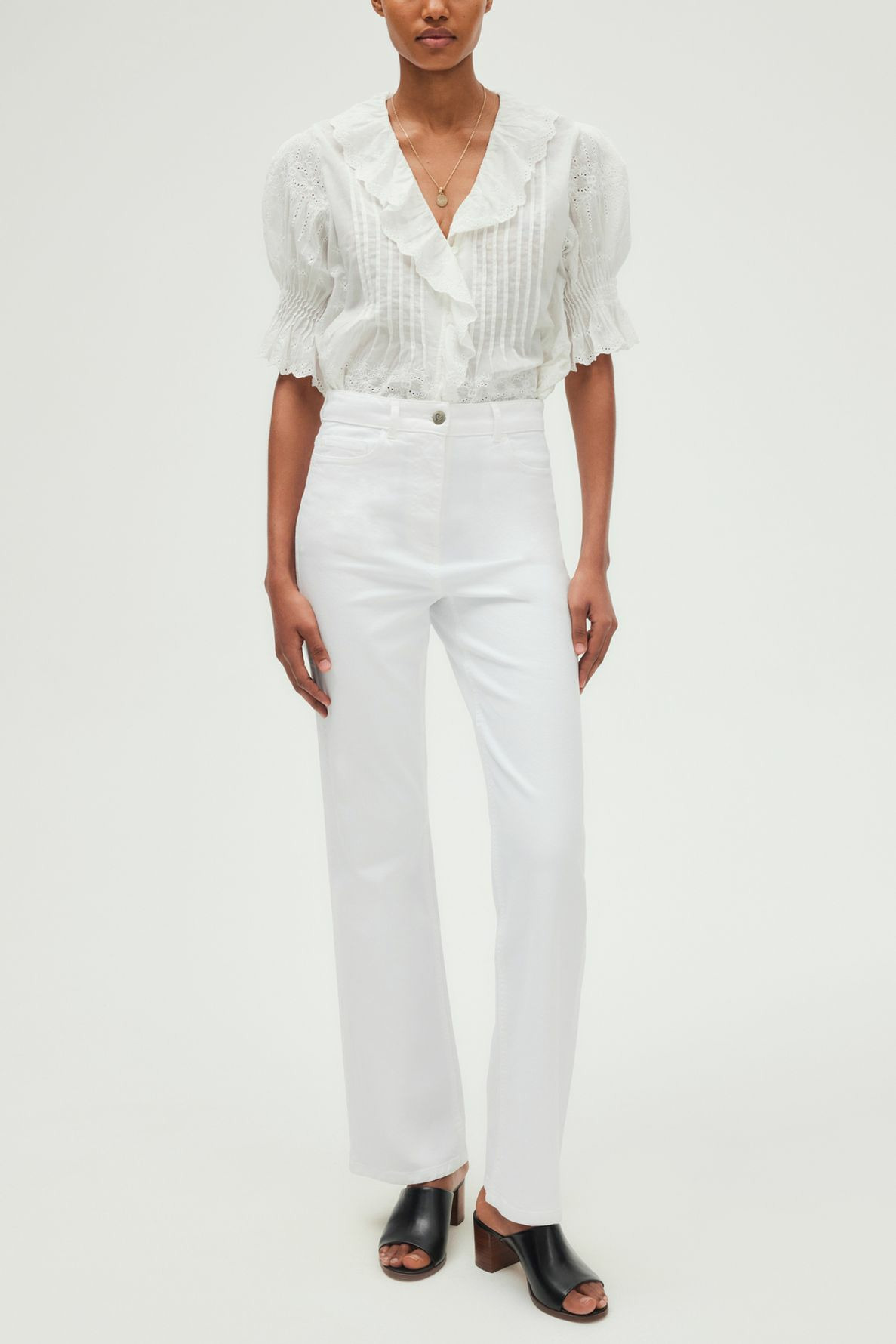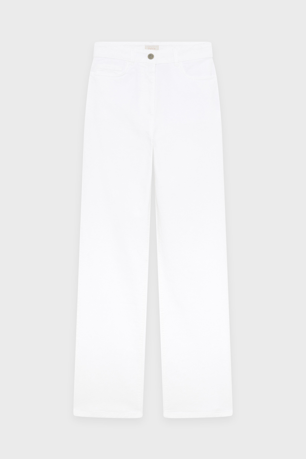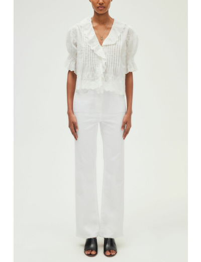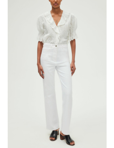 Jean long en coton uni blanc, coupe flare à taille haute. Modèle cinq poches avec ceinture montée à passants. Fermeture par zip sous patte et bouton rond. Matière stretch pour un confort accru.