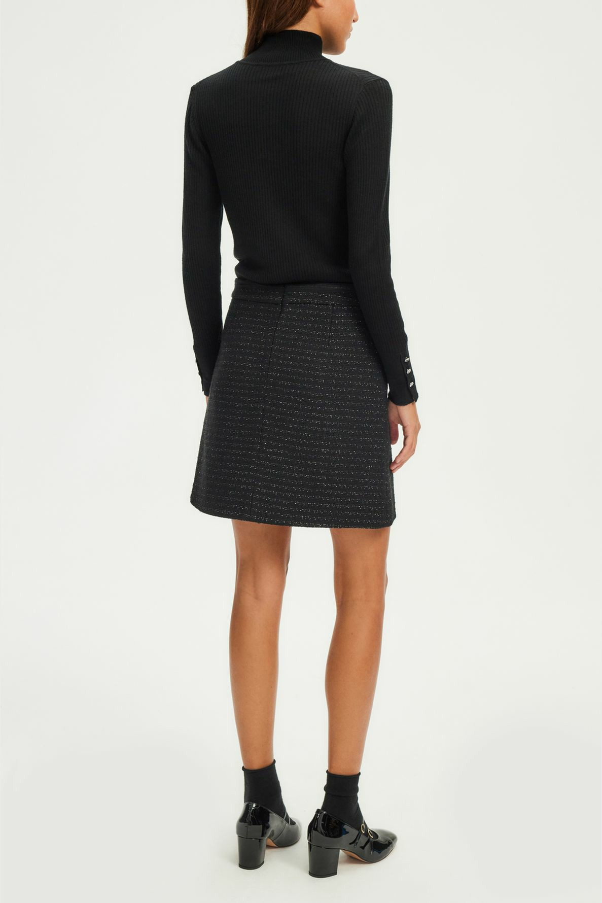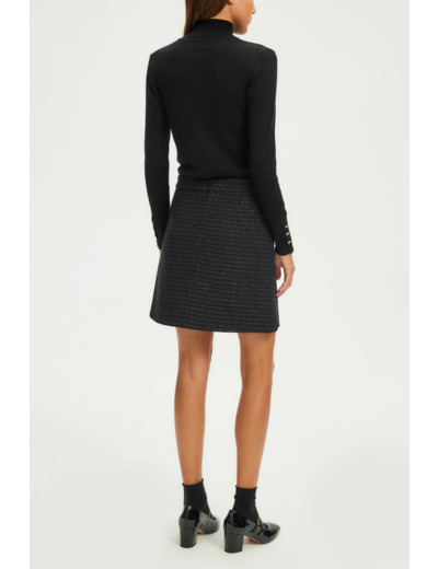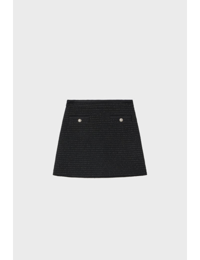 Forme droite légèrement évasée, motif tweed, jupe courte. Fermeture zippée dans le dos. Poches plates passepoilées avec bouton gravé. Taille et poches gansées d’un fil brillant. La mannequin mesure 176 cm et porte une taille 38.